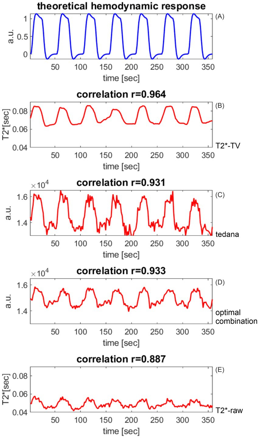 Figure 9. Similarity between the shape of the theoretical hemodynamic response and the BOLD signal calculated from three echoes at the best-matching voxel. (A) Theoretical hemodynamic response. (B) T2* mapping from three TV-denoised echoes. (C) tedana.py-denoised BOLD signal; (D) “optimal combination” of three echoes: weighted sum of the three echoes contributes to denoising. (E) T2* estimate from three unprocessed echoes: the noise in the measured three echoes is amplified by the T2* mapping, and results in low correlation values. The TV-based T2* signal (B) is smooth, as required by the theory of BOLD response to stimulation and confirmed by invasive BOLD signal measurements. Smoothness was achieved thanks to the denoising properties of the total-variation-based Rudin–Osher–Fatemi algorithm, which—unlike classical approaches—suppresses temporally isolated local disturbances of limited extent rather than additive time series (fourier components, principal components, independent components, etc.).