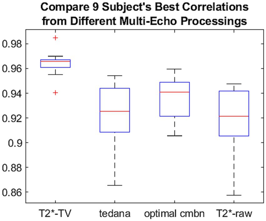 Figure 10. Boxplots of the medians (red lines) and interquartile ranges (box heights) for nine subjects of the best correlation values between fMRI signals resulting from different types of multi-echo processing and the normalized hemodynamic response. As explained in Table 1, the median for the T2*-TV method (red line) is significantly higher than correlation medians obtained for the other multi-echo BOLD signal processing methods. The narrow IQR of the T2*-TV indicates that the correlation values are less dispersed for the T2*-TV method than for other types of multi-echo fMRI signal processing.