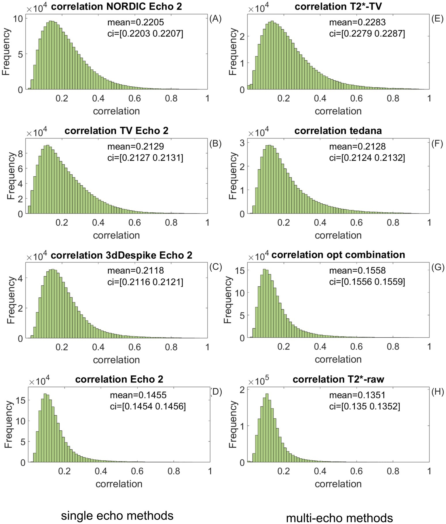 Figure 11. Histograms of the mean normalized correlation between the normalized theoretical hemodynamic response to stimulation and the normalized outcome of four single-echo and four multi-echo fMRI preprocessing methods. (A). Among single-echo methods, the NORDIC denoising yields the highest stimulus–response correlation, with the distribution for TV-based echo denoising (B) visually almost indistinguishable. All three single-echo denoising methods, including 3dDespike (C), improve correlation substantially compared to (D), the unprocessed echo 2. Total-variation-based T2* mapping (E) yields the best correlation among the multi-echo methods, with tedana (F) closely following. For the “optimal combination” (G), the effect size is surprisingly low—the mean value is barely higher than that of the unprocessed single-echo signal (D). T2* mapping from raw echoes (H) deteriorates the correlation, probably due to noise amplification through the log-linear fitting.