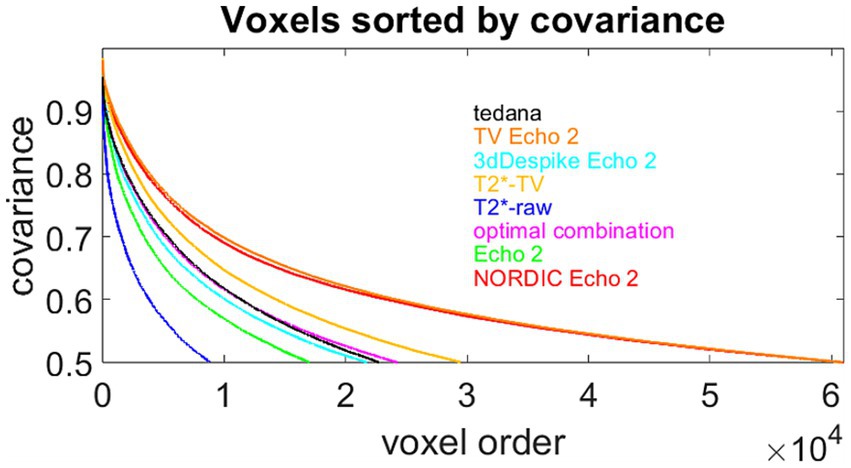 Figure 12. Another view of the effect sizes. The colored lines display, for all eight fMRI preprocessing methods, sorted voxels whose correlation with the theoretical response to stimulation is greater than 0.5. The intersection of each curve with the horizontal axis suggests how many such voxels were produced by the respective method. Single-echo NORDIC denoising and the novel TV-based echo denoising produced the highest numbers of high-correlation voxels, as expected from the good agreement between the histograms in Figures 12A,B.