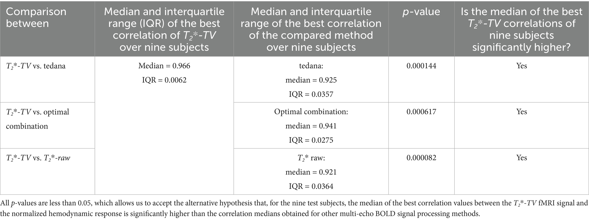 Figure 9 depicts only the results from the first volunteer. To verify that the T2*-TV method brings about statistically significant improvements, we further performed statistical tests on data from all study participants. As the distribution of correlation values is bounded to [−1,1], it was not possible to check for differences in the correlation averages using the t-tests or ANOVAs, because they assume the data to be normally distributed. We instead tested the hypothesis that the best correlation values are samples from continuous distributions with equal medians, against the alternative that they are not. This was performed using the non-parametric Wilcoxon (or ranksum) test. In three pairwise Wilcoxon tests, we compared the median of the best correlation values across all study participants between the new T2*-TV method and another well-established method of multi-echo BOLD signal preprocessing. Significance level of the tests was α = 0.05. We calculated the Wilcoxon tests using the MATLAB ranksum function. Table 1 summarizes the results.