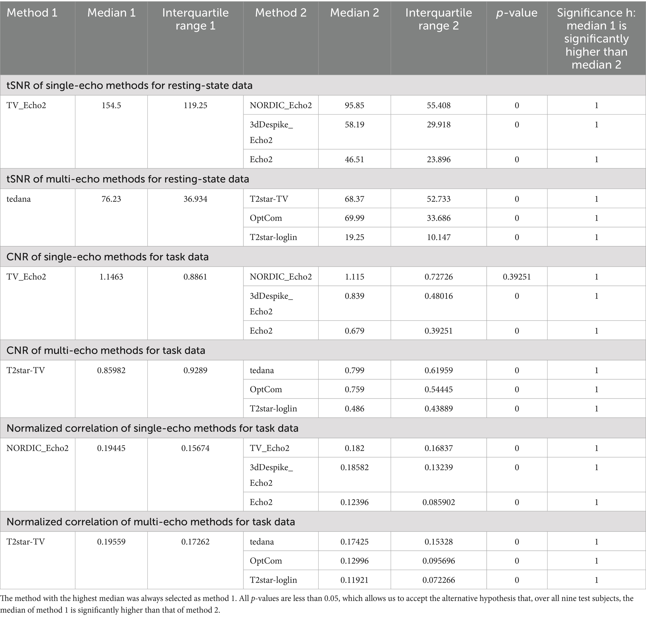 Table 2. Results of the Wilcoxon right-tailed rank sum test for comparing the tSNR, CNR, and correlation medians of four single-echo and four multi-echo fMRI preprocessing methods with a 5% significance level for the hypothesis test that median 1 is significantly higher than median 2.