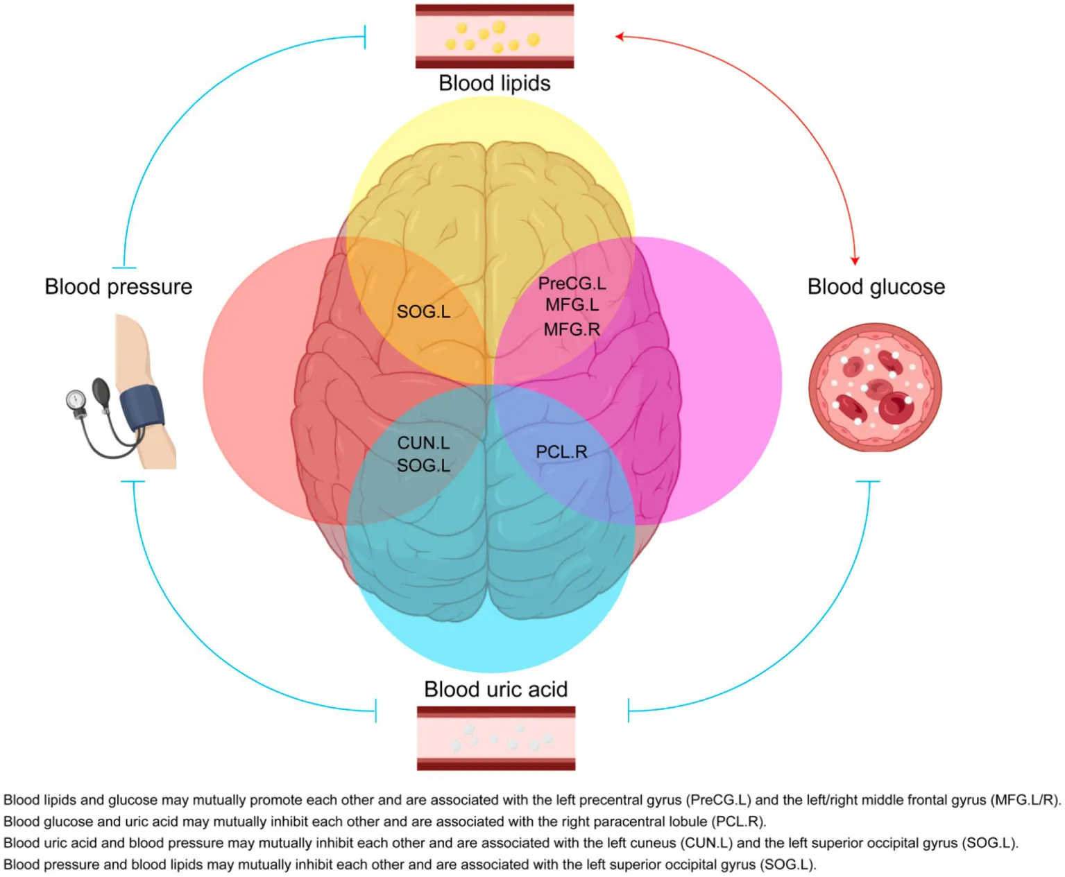 In summary, uric acid may be negatively associated with blood pressure and glucose levels, while blood glucose and lipid levels may be positively correlated. Gout appears distinct from other metabolic diseases and may offer a protective effect on brain function. The right superior parietal gyrus might be associated with both blood pressure and renal function. The left precentral gyrus and bilateral middle frontal gyrus might be associated with both fasting blood-glucose and triglycerides, implying the possible association of these brain regions with the dyslipidemia and potential atherosclerotic cardiovascular disease in patients with T2DM. Our study indicates potential connections among these metabolic diseases and the involvement of the brain in their progression.