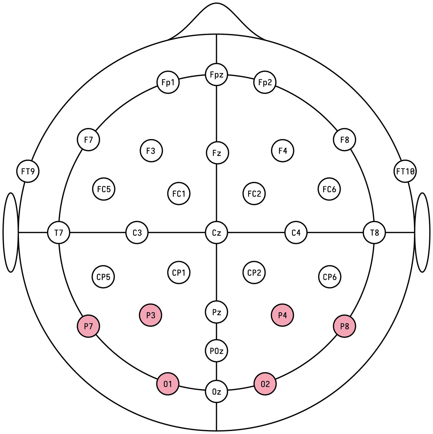 The occipito-parietal recording sites O1, O2, P3, P4, P7, and P8 formed the ROI in the experimental setup.