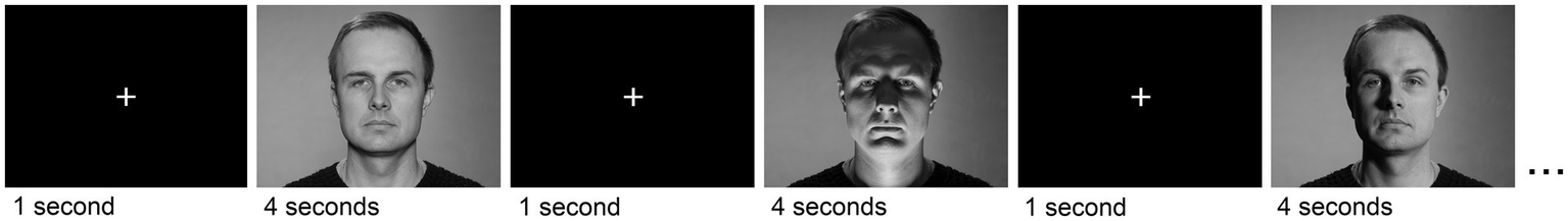 The stimulus images were presented on the laboratory microcomputer using Presentation software version 22.1 build 04.30.21 (Neurobehavioral Systems, Inc.) to control the presentation and timing of all stimuli. Each video image occupied 44.8 cm × 33.7 cm (resolution 1,440 × 1,080 pixels) on a 27-inch (69 cm) monitor (60 Hz refresh rate) that was visually calibrated for the right brightness and contrast settings. At a viewing distance of 80 cm, each picture occupied approximately 31 degrees of visual angle horizontally and 23 degrees vertically. The participants were instructed to sit still during the experiment and to look only at the center cross or the image presented on the computer screen. The center cross was positioned so that it appeared in the area between the eyes of the face depicted in the stimulus images. The experiment was monitored through a small web camera and a microphone, and the subjects were instructed to abort the experiment, if they felt any discomfort.