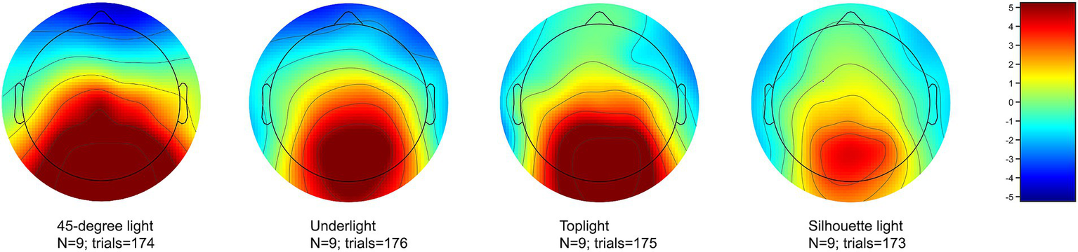The increased negativity elicited by underlight (setup 4), toplight (setup 5), and silhouette light (setup 8) is also present in the voltage maps of Figures 4, 5, where the mean activation of the occipito-parietal areas of the scalp reaches less positive levels with these lighting setups compared to 45-degree light (setup 2). The visible frontal positivity, especially in the case of silhouette light within 200–600 ms (Figure 5) is a result of ocular artifacts, which were not separately cleaned from the data since they mainly affect the frontal channels that were outside the ROI of the study and not used in any analyses.