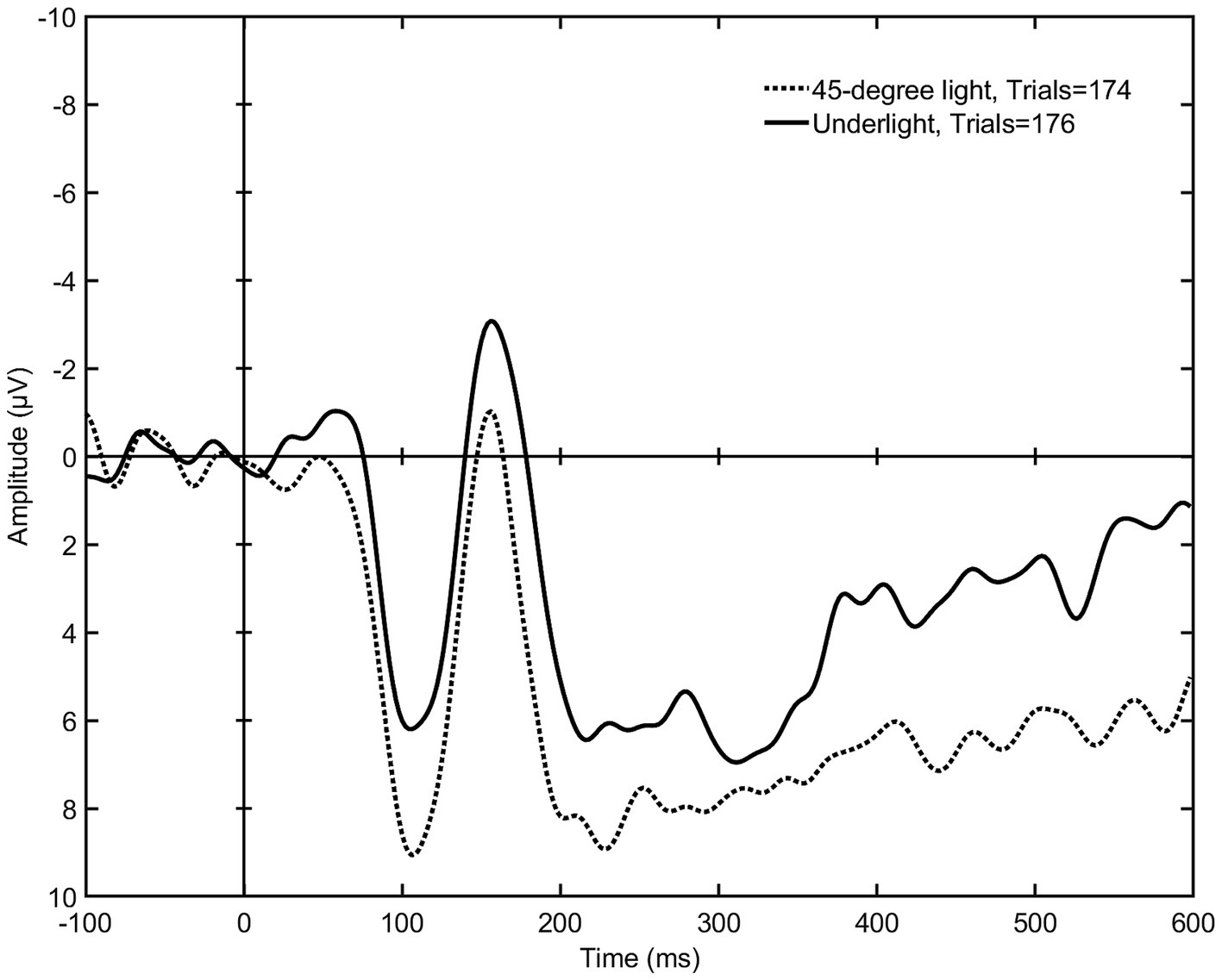 The mean signal amplitudes elicited by underlight (setup 4) and 45-degree light (setup 2) (N = 9). The graph shows a visible difference in the mean negativity within both 150–300 and 200–600 ms after stimulus, although the latter failed to reach a statistical significance. This indicates that a lighting that comes from below the face distorting the facial features elicits a stronger early emotional reaction than a lighting that reveals the whole face.
