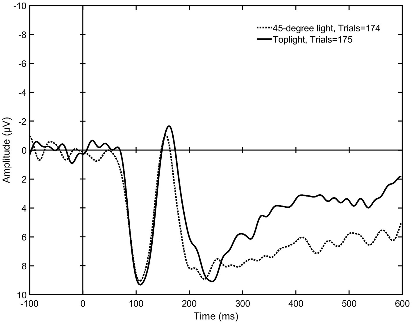 The mean signal amplitudes elicited by toplight (setup 5) and 45-degree light (setup 2) (N = 9). The graph shows a visible difference in the mean negativity, especially around 300 ms onwards, indicating that a lighting that comes from above the subject leaving the eyes invisible elicits a stronger early emotional reaction than a lighting that reveals the whole face.