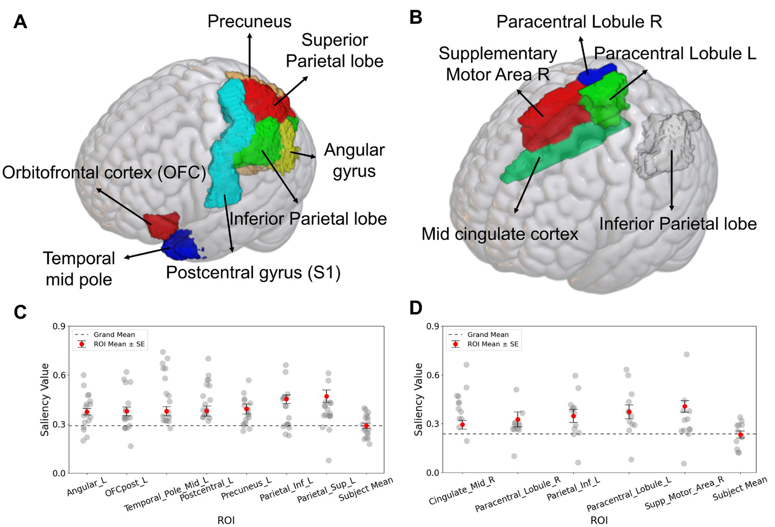 Figure 5. Salient ROIs identified by Grad-CAM analysis for the SFCN classification model. (A) For classification of the occurrence of the Aristotle illusion vs. Reverse illusion, the superior parietal lobule, inferior parietal lobule, precuneus, postcentral gyrus (S1), middle temporal pole, orbitofrontal cortex (OFC), and angular gyrus were significantly above the grand mean (p < 0.05). (B) For the occurrence vs. absence of the Reverse illusion, the supplementary motor area (SMA), paracentral lobule, inferior parietal lobule, and middle cingulate cortex were identified as salient ROIs. (C) Subject-wise saliency values for each significant ROI in the Aristotle illusion vs. Reverse illusion. (D) Subject-wise saliency values for each significant ROI in the presence vs. absence of the Reverse illusion. Each gray dot represents one participant. Red circles indicate the mean saliency of each ROI, with black bars representing the standard error. The dashed line represents the grand mean across all brain regions.