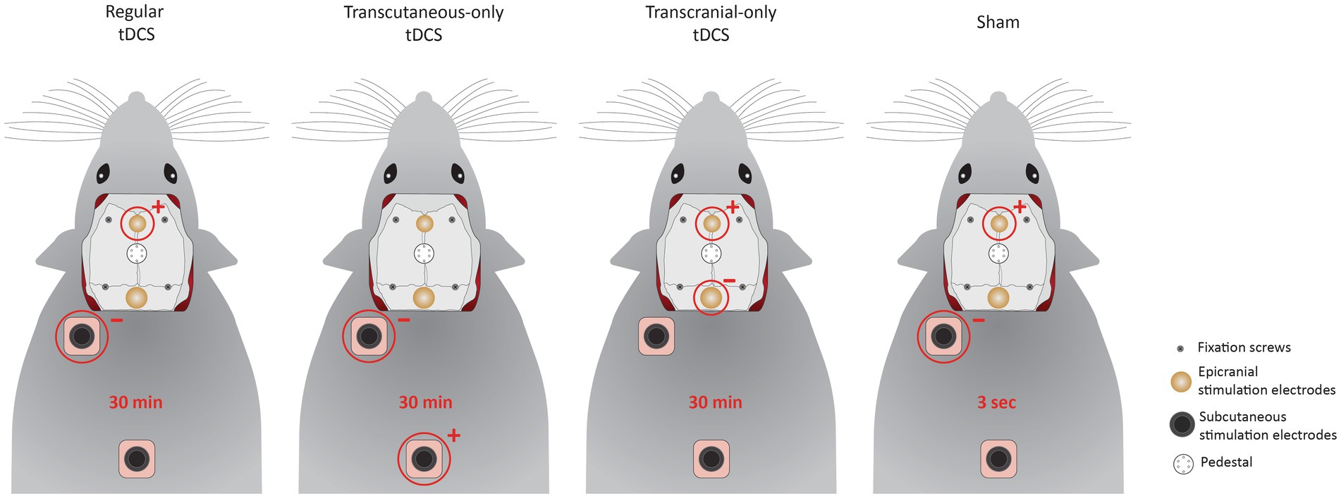Rats were randomly divided into the following stimulation groups: regular tDCS, transcutaneous-only tDCS, transcranial-only tDSC, and sham (Figure 1). In regular tDCS, stimulation was performed through the ventral epicranial electrode (anodal) and subcutaneous electrode over the third occipital nerve (cathodal). For transcutaneous-only tDCS (i.e., stimulation of the skin, but not the brain), the anodal electrode was changed to the subcutaneous electrode on the central back. For transcranial-only tDCS (i.e., stimulation of the brain, but not the skin), the ventral (anodal) and dorsal (cathodal) epicranial electrodes were used. In the sham group, stimulation was turned on for only 3 s through the regular tDCS electrode combination, but cables remained connected throughout the full 30 min.