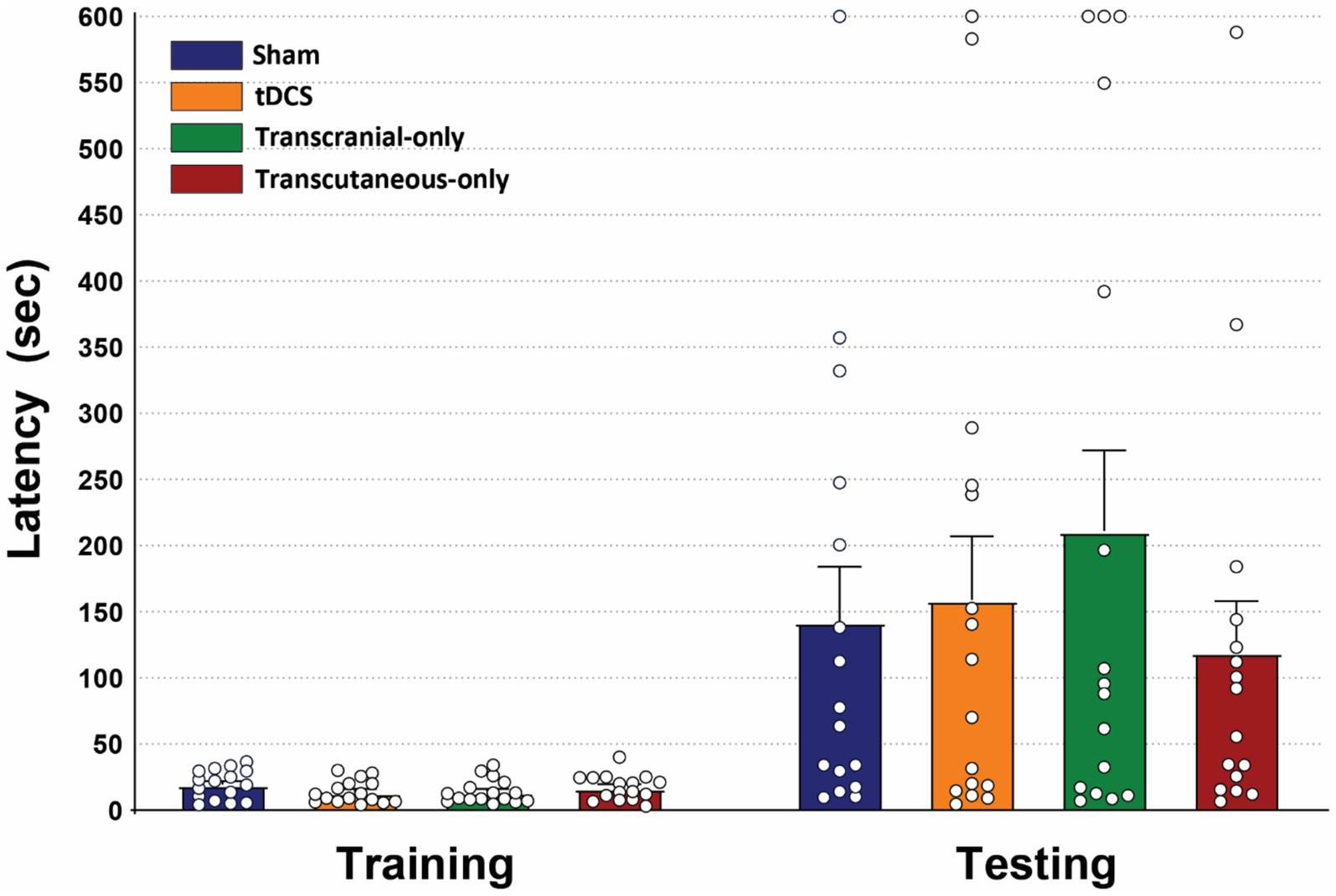 Within-group analyses were performed using the Wilxocon matched-pairs signed rank test and revealed that rats in all groups had a greater step-through latency in the testing session compared to the training session, indicating that learning was successful in all groups. For sham, Wilcoxon matched-pairs signed rank (n = 16), W = 112.0, p = 0.0021, median of differences = 57.50. For regular tDCS, Wilcoxon matched-pairs signed rank (n = 16), W = 120.0, p = 0.0008, median of differences = 80.10. For transcutaneous-only tDCS, Wilcoxon matched-pairs signed rank (n = 16), W = 120.0, p = 0.0008, median of differences = 76.80. For transcutaneous-only tDCS, Wilcoxon matched-pairs signed rank (n = 16), W = 124.0, p = 0.0004, median of differences = 57.10.