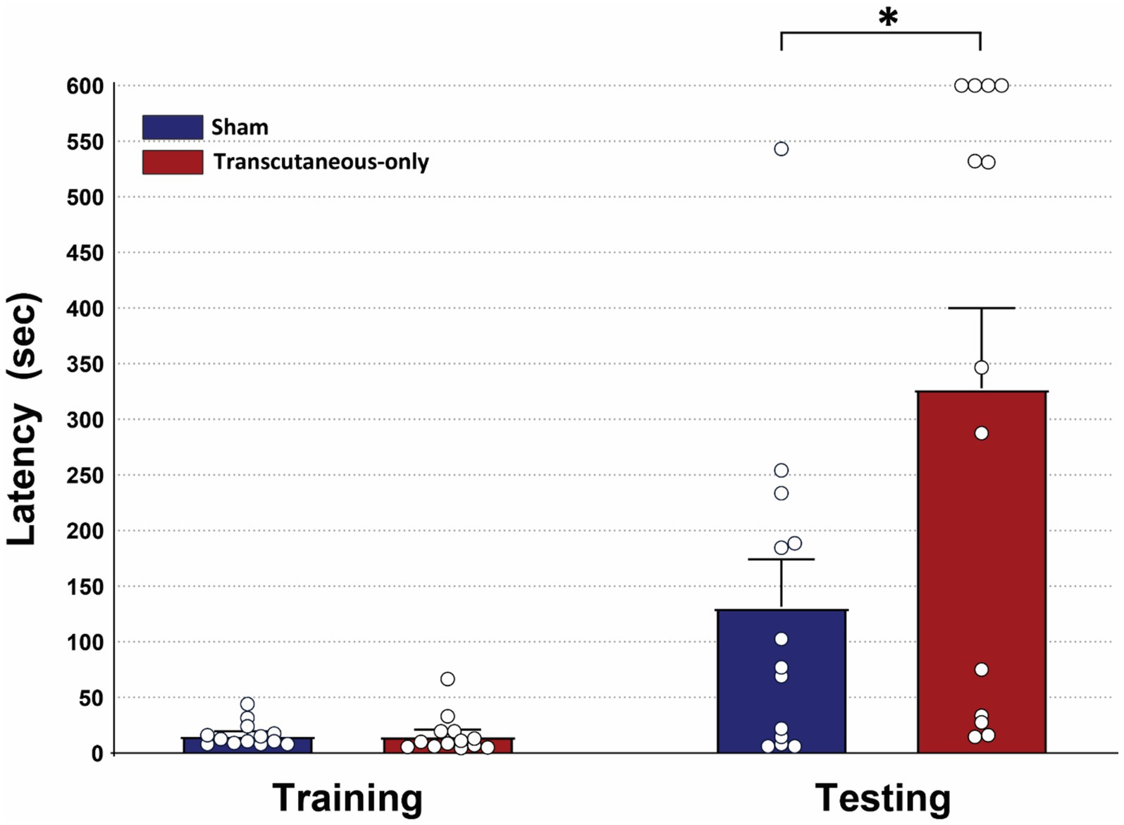 Figure 3. Memory retention in the passive avoidance task was improved by 30 min of transcutaneous-only DC stimulation at 2 mA. Mann–Whitney U tests of the step-through latencies showed no significant difference between sham and transcutaneous-only tDCS during the training session, but found a significant difference between sham and transcutaneous-only tDCS during the testing session. Data are presented as mean ± SEM; N = 13 rats per group; *p < 0.05.