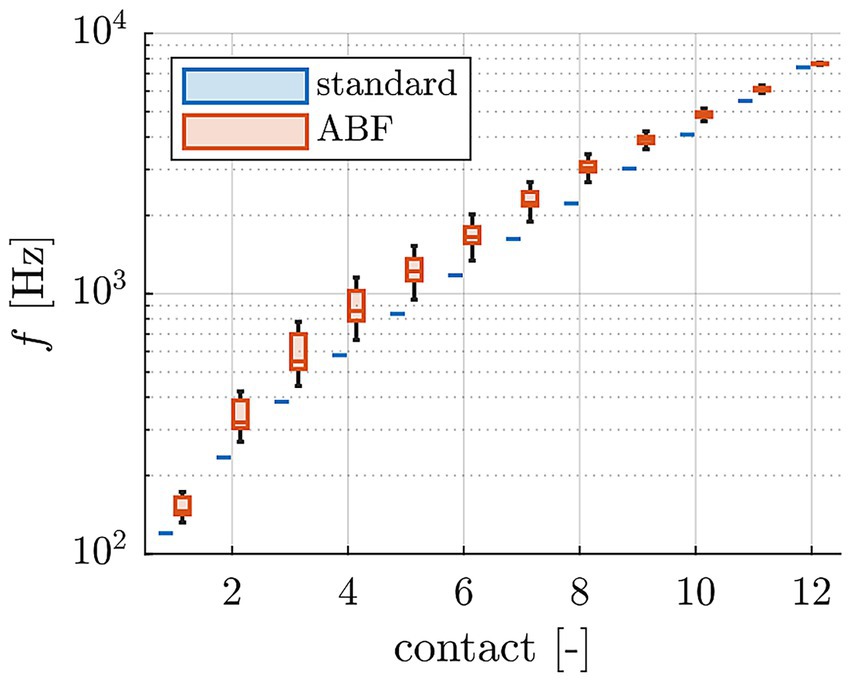 Box plot showing frequency \(f\) in Hertz against contact. Blue lines represent the standard measurement and red boxes represent ABF. Frequency increases with contact number, ranging from 100 to 10,000 Hertz.