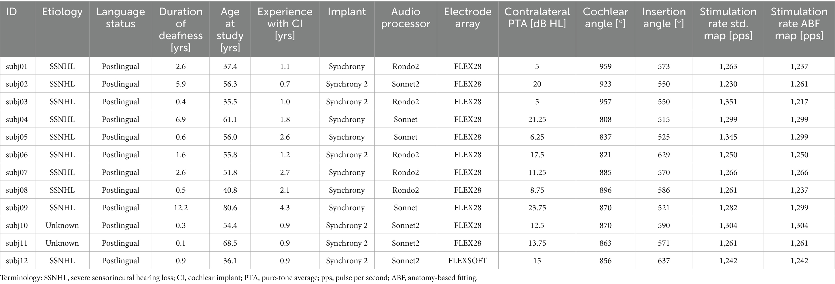 Initially, 13 subjects (seven female, six male) were recruited from the CI database at the German Hearing Center (DHZ) and enrolled in the study. One subject dropped out due to personal reasons related to the COVID-19 pandemic, resulting in a total study cohort of 12 subjects (7 female, 5 male). All subjects were CI users with postlingual single-sided deafness (SSD), native German speakers, and older than 18 years (mean: 52.9 years; range: 35.5–80.6 years) at the time of enrolment in the study. Subjects were only enrolled in the study if they had no functional residual hearing on the implanted side (ipsilateral hearing threshold of ≥ 65 dB HL at 250 Hz), and normal hearing or near-normal hearing on the non-implanted side (contralateral four-frequency pure-tone average, 4-PTA, of ≤ 30 dB HL). Additionally, subjects were only included in the study if they had at least 6 months experience with their implant (mean: 20.2 months; range: 8.6–52.0 months), and if they had at least one prior test result greater than 0% correct in the Hochmair, Schulz, Moser (HSM) sentence test in noise at 10 dB SNR (Hochmair-Desoyer et al., 1997). Of the 12 subjects, six were implanted with the Synchrony and six with the Synchrony 2 implant (MED-EL, Innsbruck, Austria), with either the FLEX28 electrode array (n = 11) or the FLEXSOFT electrode array (n = 1). Subjects were using either the RONDO 2 (n = 5), the SONNET (n = 3), or the SONNET 2 (n = 4) audio processors prior to the study. Due to technical limitations of the SONNET and the RONDO 2 audio processors, subjects using these processors were fitted with a SONNET 2 audio processor for the duration of the study. A detailed overview of the subjects’ demographic data is given in Table 1. Note that all study subjects were fitted with the FS4 stimulation strategy. The stimulation rates stated in Table 1 hence do not refer to the apical channels which also deliver temporal information when defined as fine-structure channels during fitting. In case of the present study, this was the case for the apical 4 contacts for all subjects.