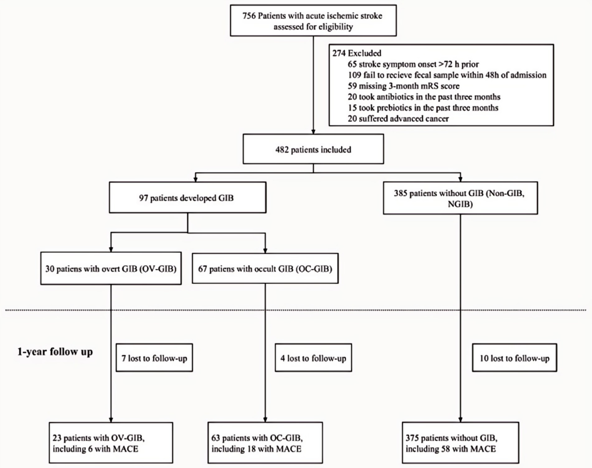 Although direct evidence establishing a causal or independent correlative link between occult GIB and gut dysbiosis specifically in ischemic stroke patients is still evolving, a compelling body of recent research strongly suggests a plausible and mechanistically supported pathophysiological connection via the brain-gut axis (Xu et al., 2021; Meng et al., 2023; Zhang et al., 2025). While previous studies, including our own, have established stroke-induced gut dysbiosis and its association with systemic complications (Stanley et al., 2016), the specific link between the abundance of gut pathogens and the occurrence of occult GIB during the acute phase of stroke—a common yet underdiagnosed complication—remains markedly understudied. Therefore, to address this significant gap in knowledge, the present study aims to: (1) investigate the association between occult GIB and long-term prognosis in AIS patients, including 90-day dependency and one-year major adverse cardiovascular events (MACEs, including death and recurrent ischemic stroke); (2) explore the association between gut potential pathogens (and their metabolites), and occult GIB; and (3) examine the potential link between increased gut potential pathogens and long-term outcomes.