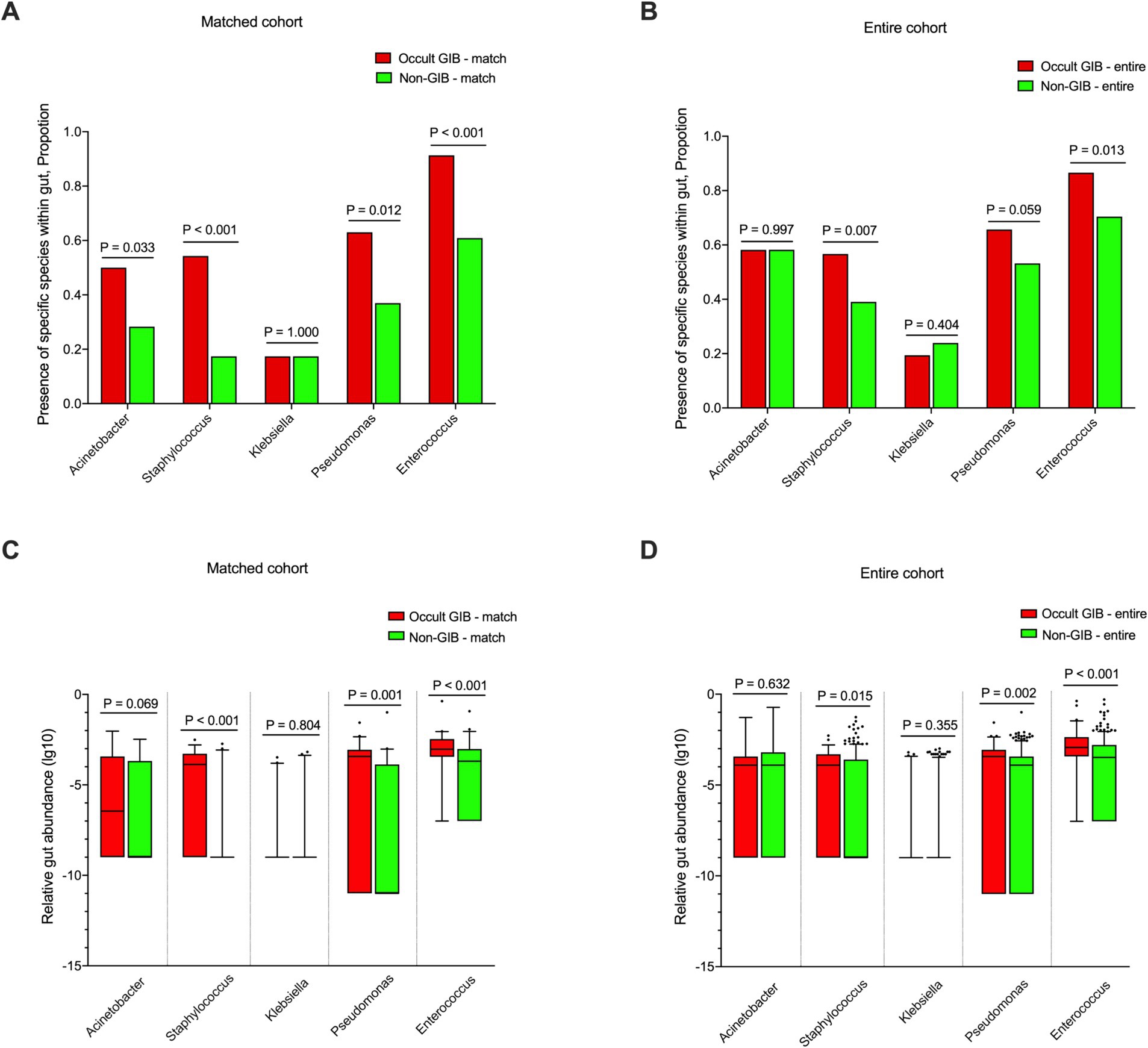 Figure 2. Presence of specific gut pathogens during the acute stage post-stroke in occult GIB and Non-GIB patients, in both the matched cohort and the entire cohort. (A,B) The five most common culture-proven infections were from Acinetobacter species (spp.), Staphylococcus spp., Klebsiella spp., Pseudomonas spp. and Enterococcus spp. Presence of these five most common potential pathogens based on sequencing data in patients with occult GIB compared to patients with Non-GIB in the age-, NIHSS- and dysphagia-matched cohort (A) and the entire cohort (B). (C,D) Relative abundance of these five potential pathogens in the occult GIB patients and the Non-GIB patients in the matched cohort (C) and the entire cohort (D).