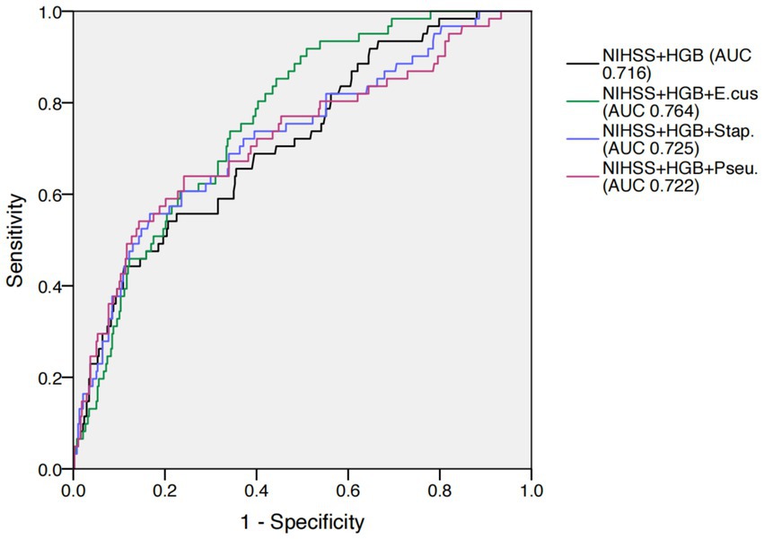 Receiver operating characteristic (ROC) analysis showed that adding Enterococcus, Staphylococcus, or Pseudomonas separately to the clinical model (admission NIHSS and hemoglobin) significantly improved the area under the curve (AUC) for identifying occult GIB, increasing from 0.716 to 0.764, 0.725, and 0.722, respectively (all p < 0.05; Figure 3).