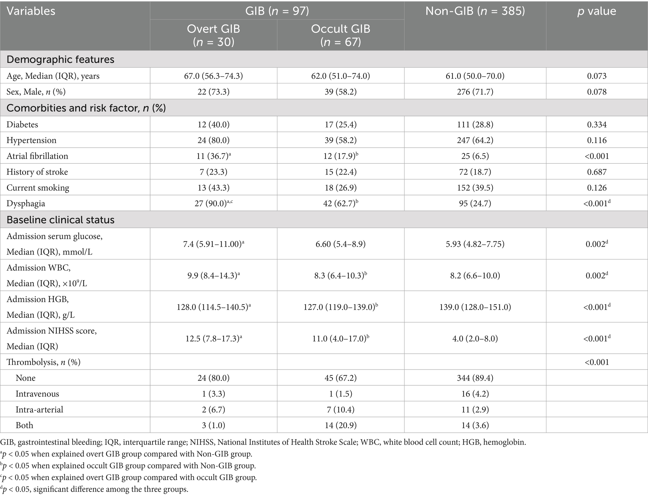 A total of 482 AIS patients with 3-month follow-up outcomes were included in the final analyses, with 21 patients (4.36%) lost to follow-up by the end of the 1-year observational period. Of these, 97 patients (20.1%) experienced gastrointestinal bleeding (GIB) post-stroke, including 67 (13.9%) with occult GIB and 30 (6.2%) with overt GIB. No significant differences were observed in age, smoking status, diabetes, hypertension, or stroke history among the occult GIB, overt GIB, and non-GIB groups. However, both GIB cohorts had lower hemoglobin levels and higher NIHSS scores compared to the non-GIB group. Admission glucose levels and WBC counts did not significantly differ between the occult GIB and non-GIB groups (Table 1).