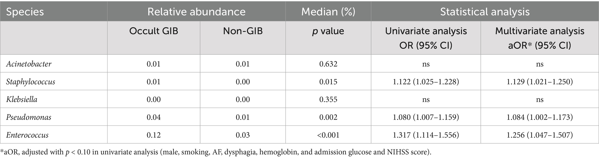 Multivariate logistic regression analyses identified gut Staphylococcus (aOR, 1.129, 95% CI [1.021–1.250]), Pseudomonas (aOR, 1.084, 95% CI [1.002–1.173]), Enterococcus (aOR, 1.256, 95% CI [1.047–1.507]) were independently associated with occult GIB, after adjustment for clinical factors, including admission NIHSS and hemoglobin (all p < 0.05, Table 3).