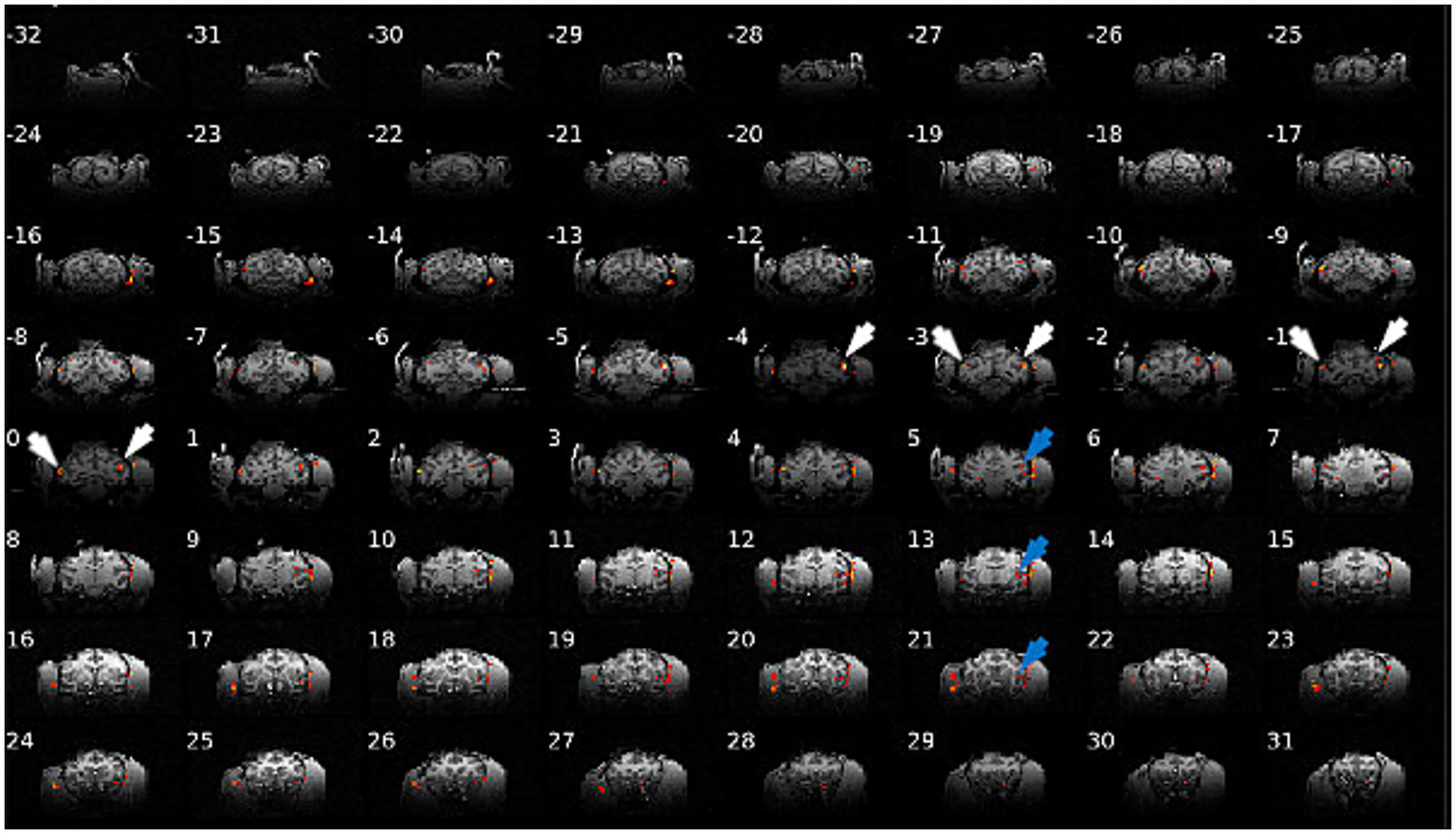 Brain activation in monkey D during ECS sinewave stimulation (10 Hz, 3 mA). ECS can activate target areas under the electrodes (white arrows) in addition to a series of other cortical sites (blue arrows).