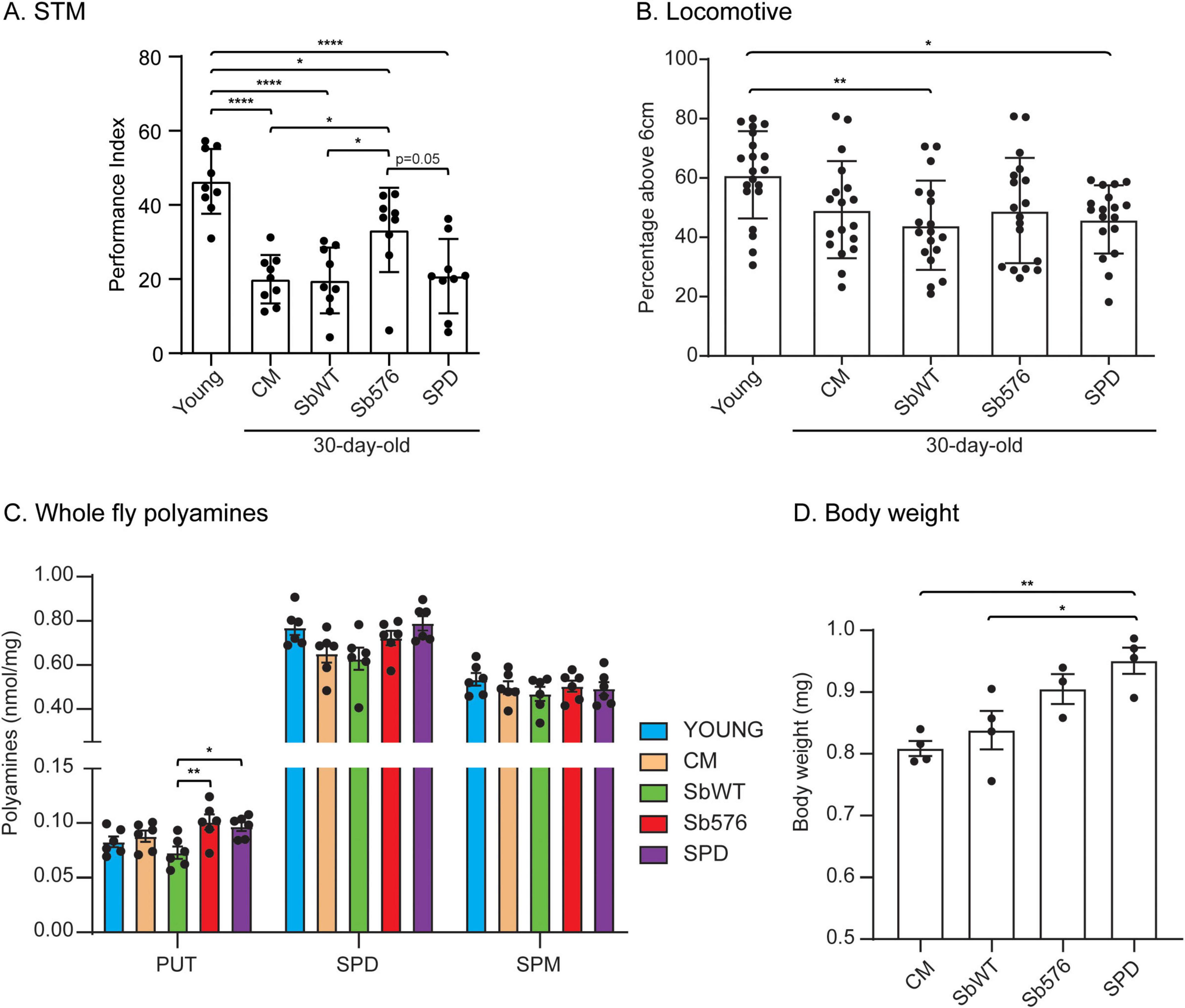 Figure 1. Sb576 reduces aging-associated short-term memory (STM) decline in flies. (A) STM performance scores of young flies and flies after 30-day feeding on CM without supplementation or supplemented with spermidine or live wild-type Sb SbWT or Sb576. (B) Locomotive ability test of the same flies following the olfactory memory test in (A). (C) Whole body polyamine levels in young flies and 30-day old flies fed on CM or CM plus the indicated supplementation. (D) Body weight of 30-day-old flies after feeding on CM or CM supplemented with spermidine or live SbWT or live Sb576. Each dot represents the mean of a group of flies (between 58 and 91, both male and female). (A–D) Shown are means with SEM. One-way ANOVA and Tukey’s multiple comparisons test. *, p < 0.05; **, p < 0.001; ****, p < 0.0001.