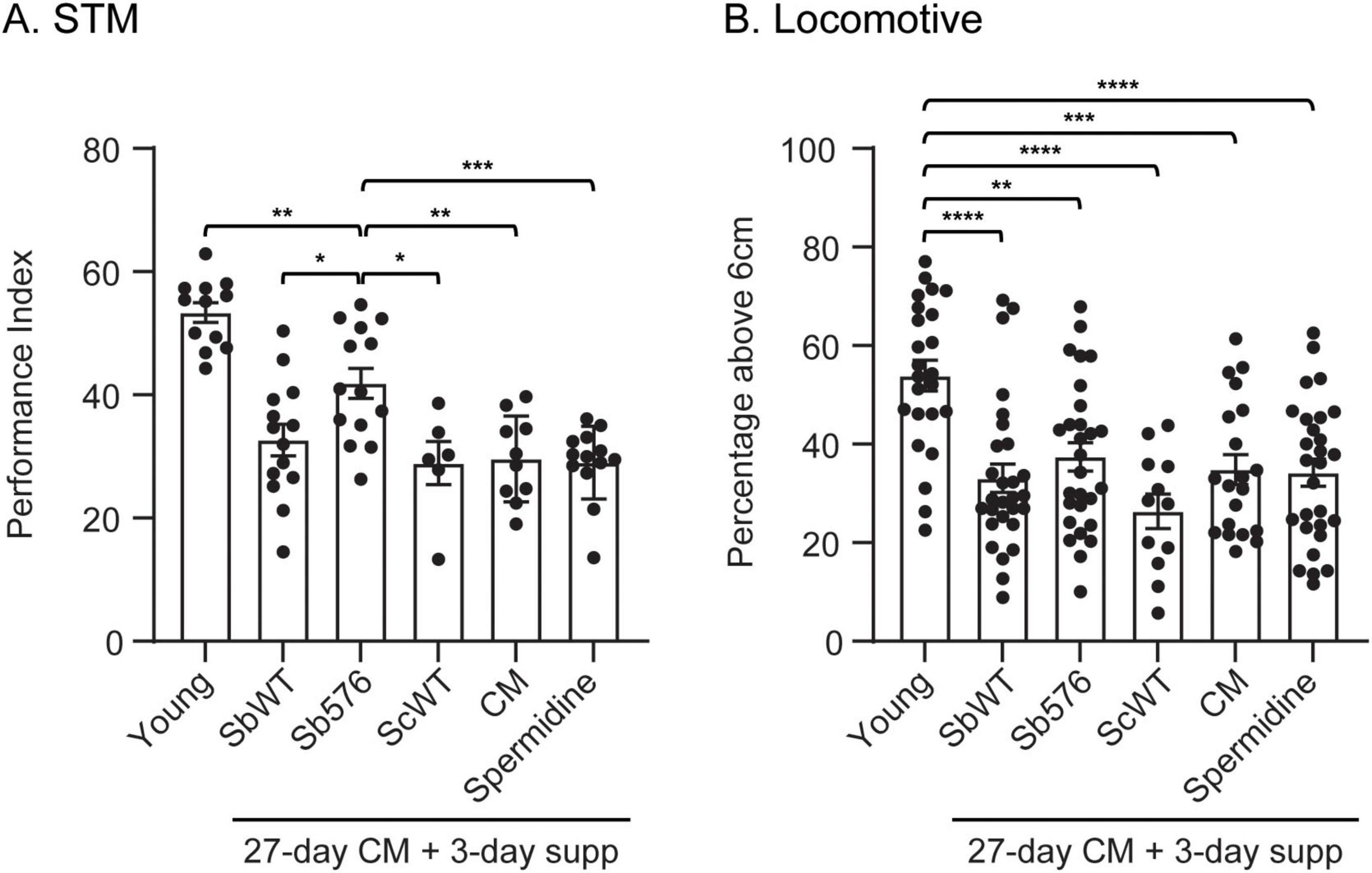 Figure 2. Sb576 enhances short-term memory (STM) in aged flies. Newly eclosed flies were fed on cornmeal food (CM) for 27 days before transferring to yeast-free cornmeal food (CM–Sc) supplemented with live ScWT, SbWT, or Sb576, or to cornmeal food (CM) with or without 1 mM spermidine. Flies were tested 3 days later, with young flies as control, for olfactory memory (A) and locomotive ability (B). Shown are means with standard error of the mean (SEM). In addition to the differences shown, the young group is significantly different (****) from all other groups (A). One-way ANOVA and Tukey’s multiple comparisons test. *, p < 0.05; **, p < 0.01; ***, p < 0.001 ****, p < 0.0001.
