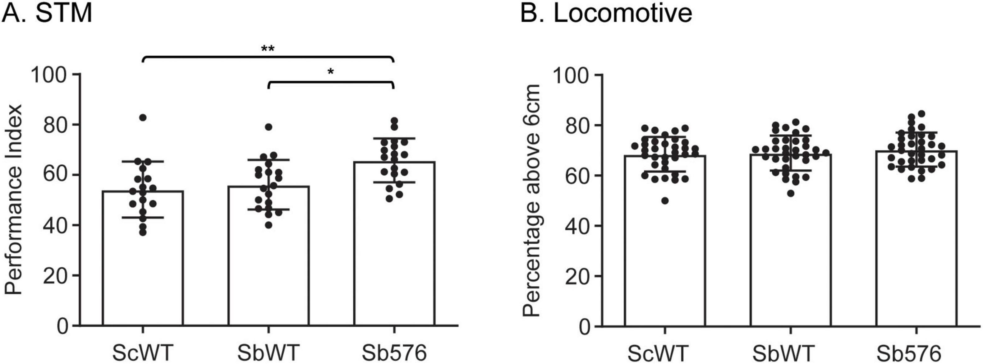 “Bar graphs comparing performance indices across three groups: ScWT, SbWT, and Sb576. Panel A shows the STM Performance Index with Sb576 higher than ScWT and SbWT; significant differences are marked. Panel B shows Locomotive Percentage above 6cm for the same groups, with no significant differences indicated.”