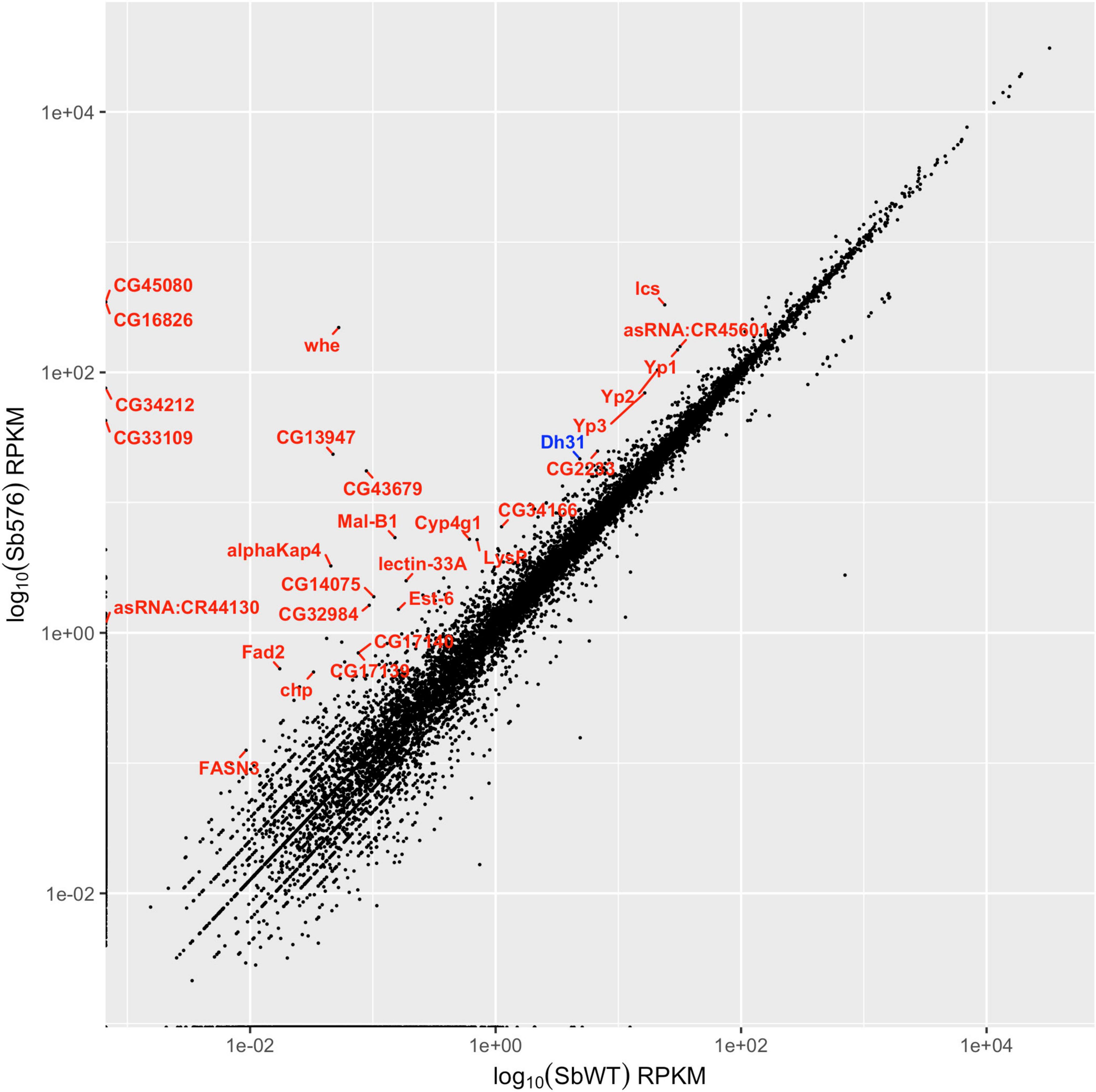 Scatter plot displaying a comparison of log-transformed RPKM values of SbWT and Sb576 genes. Data points form a diagonal cluster indicating a correlation. Some genes, labeled in red and blue, deviate from the main cluster.
