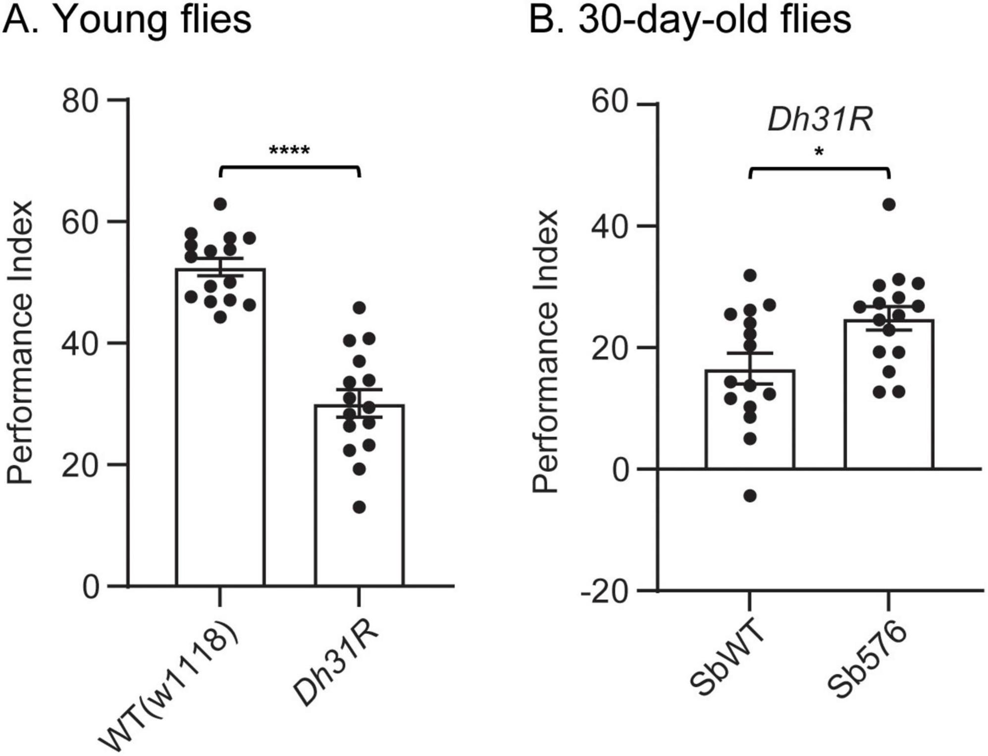 “Bar graphs comparing performance index scores between different genotypes of flies. Graph A displays young flies, with WT(w1118) scoring higher than Dh31R, indicated by four asterisks for significance. Graph B shows 30-day-old Dh31R flies, with Sb576 group slightly but significantly outperforming SbWT group, marked by one asterisk.”
