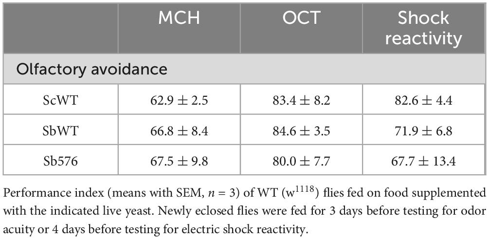 To further establish the memory enhancing effects of Sb576, we tested the various yeast supplementation on young flies. Newly eclosed flies were transferred to CMSc with the indicated live yeast supplementation and cultured for three days followed by STM test. We found that Sb576 supplementation significantly improved STM performance compared to supplementation with either ScWT or SbWT (Figure 3A). No difference was found in any group in a locomotion test (Figure 3B). To rule out the possibility that Sb576 may alter odor perception or response to electric shock used in conditioning and testing for STM assays, we performed odor acuity and shock reactivity tests and found no difference among the three groups of flies (Table 1).