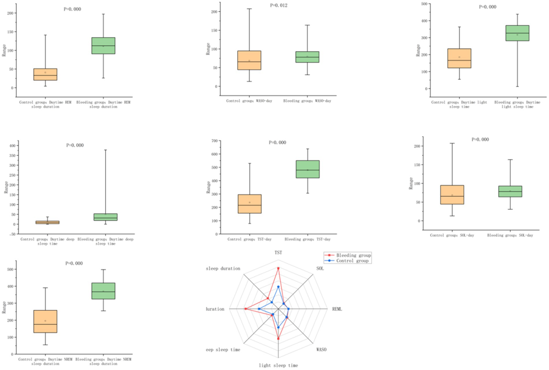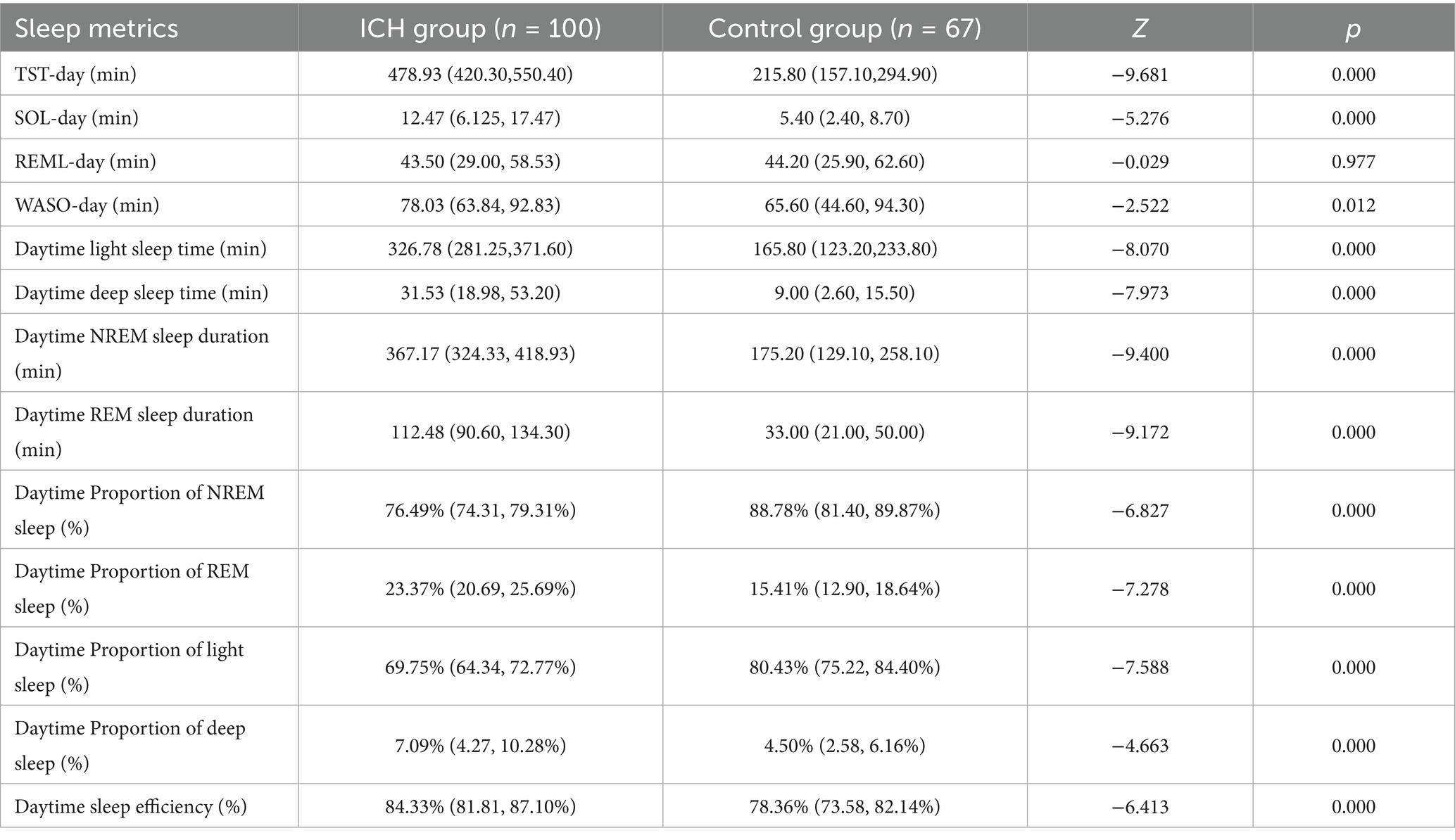 Compared to the control group, the hemorrhagic stroke group had significantly greater daytime total sleep time, durations of light sleep, deep sleep, NREM, and REM sleep, as well as higher sleep efficiency (all p < 0.05). Conversely, sleep latency, REM latency, and NREM percentage were significantly lower in the stroke group (p < 0.05). No significant difference was found between the two groups in daytime REM latency (p > 0.05) (Table 3; Figure 3).