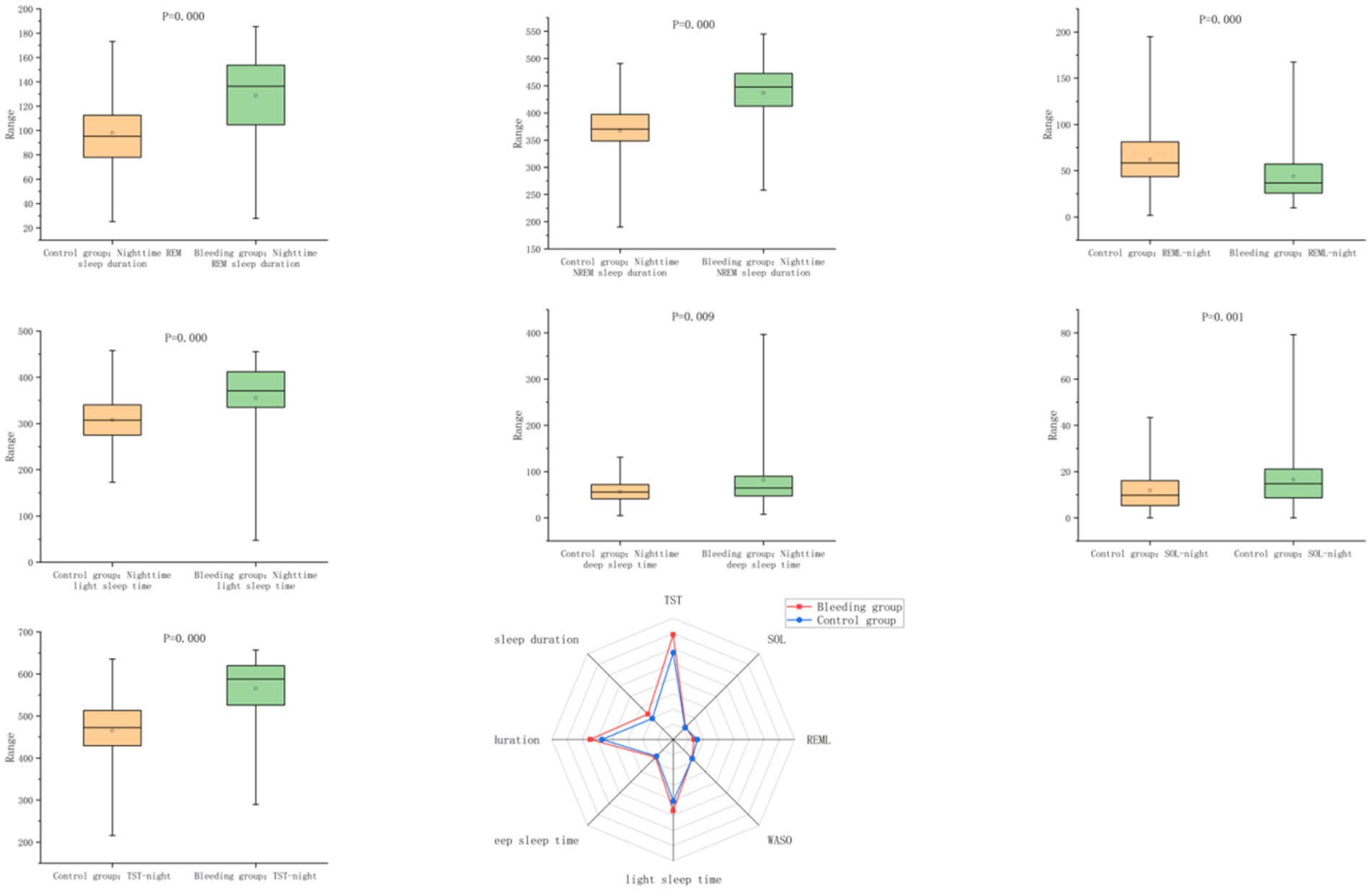 Figure 4. Comparison of nighttime sleep–wake parameters between the hemorrhagic stroke group and the control group.