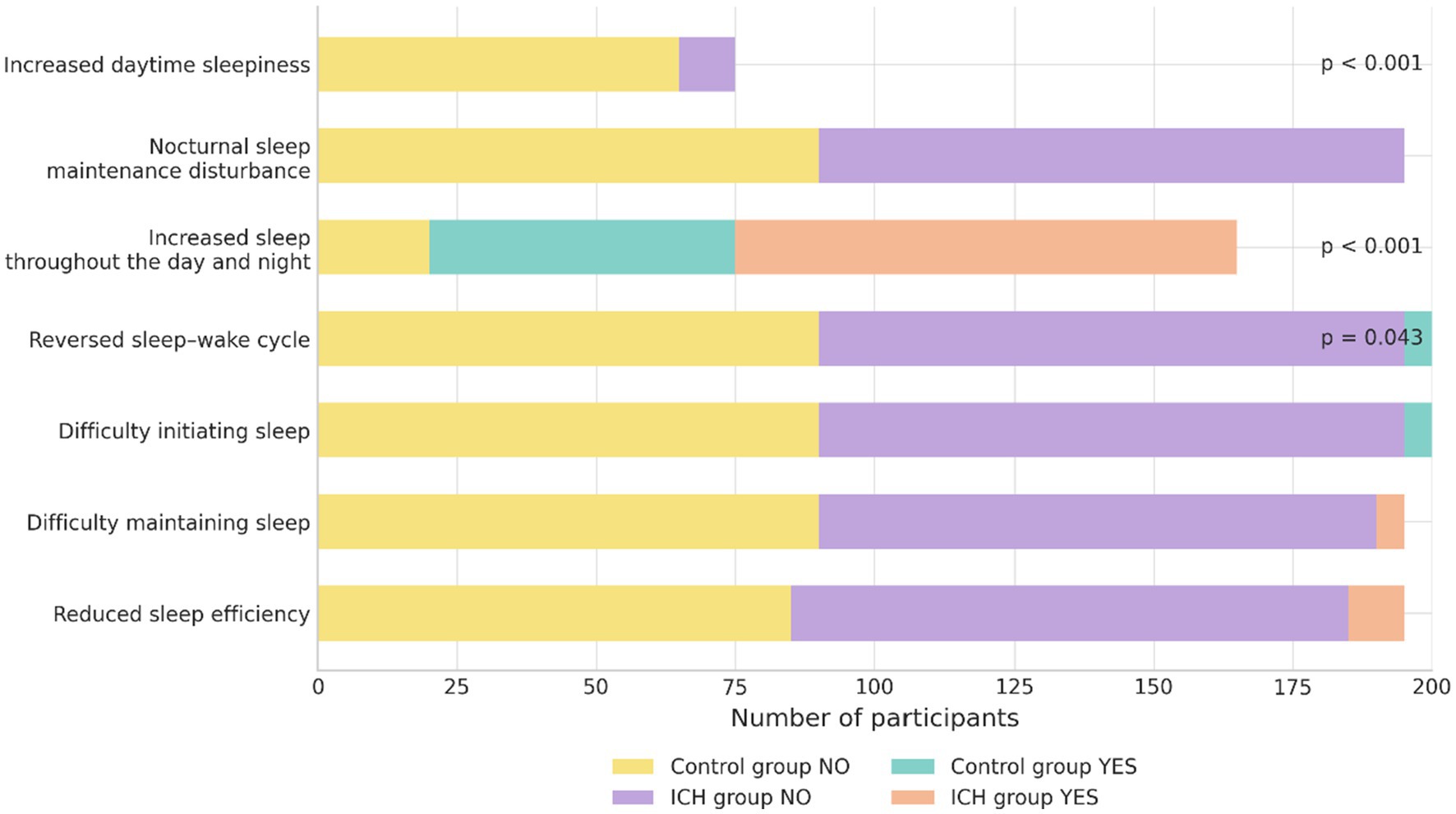 The proportions of patients exhibiting excessive daytime sleepiness, global hypersomnia, and sleep–wake cycle inversion were significantly higher in the hemorrhagic stroke group than in controls (p < 0.05). However, the incidence of nighttime sleep maintenance disorder, difficulty initiating sleep, fragmented sleep, and low sleep efficiency did not differ significantly between the two groups (p > 0.05) (Table 5; Figure 5).