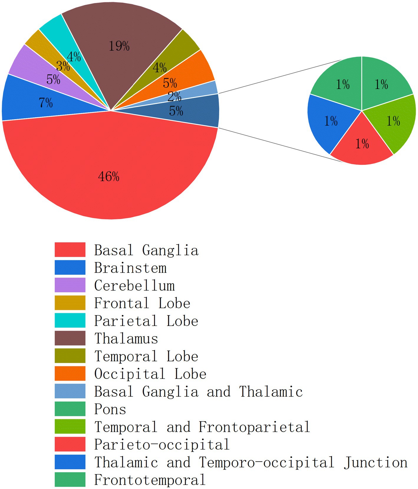 Figure 6. Distribution of hemorrhagic lesion locations in 100 patients with intracerebral hemorrhage.