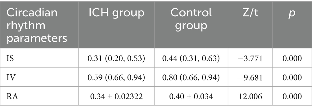 Table 2. Comparison of circadian rest–activity rhythms between the hemorrhagic stroke group and the control group.