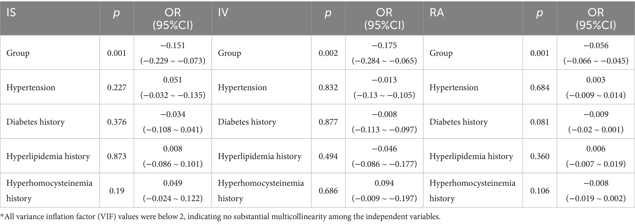 Adjustment for confounding factors: to control for the effects of potential confounding factors, we employed a multiple linear regression model to compare the differences in circadian rhythm parameters between the hemorrhagic stroke group and the control group, with adjustments for age, hypertension, diabetes, hyperlipidemia, and homocysteinemia. As shown in Table 3, after adjusting for the aforementioned variables, the hemorrhagic stroke group exhibited significantly lower IS (p < 0.001), IV (p = 0.002), and RA (p < 0.001) compared to the control group.