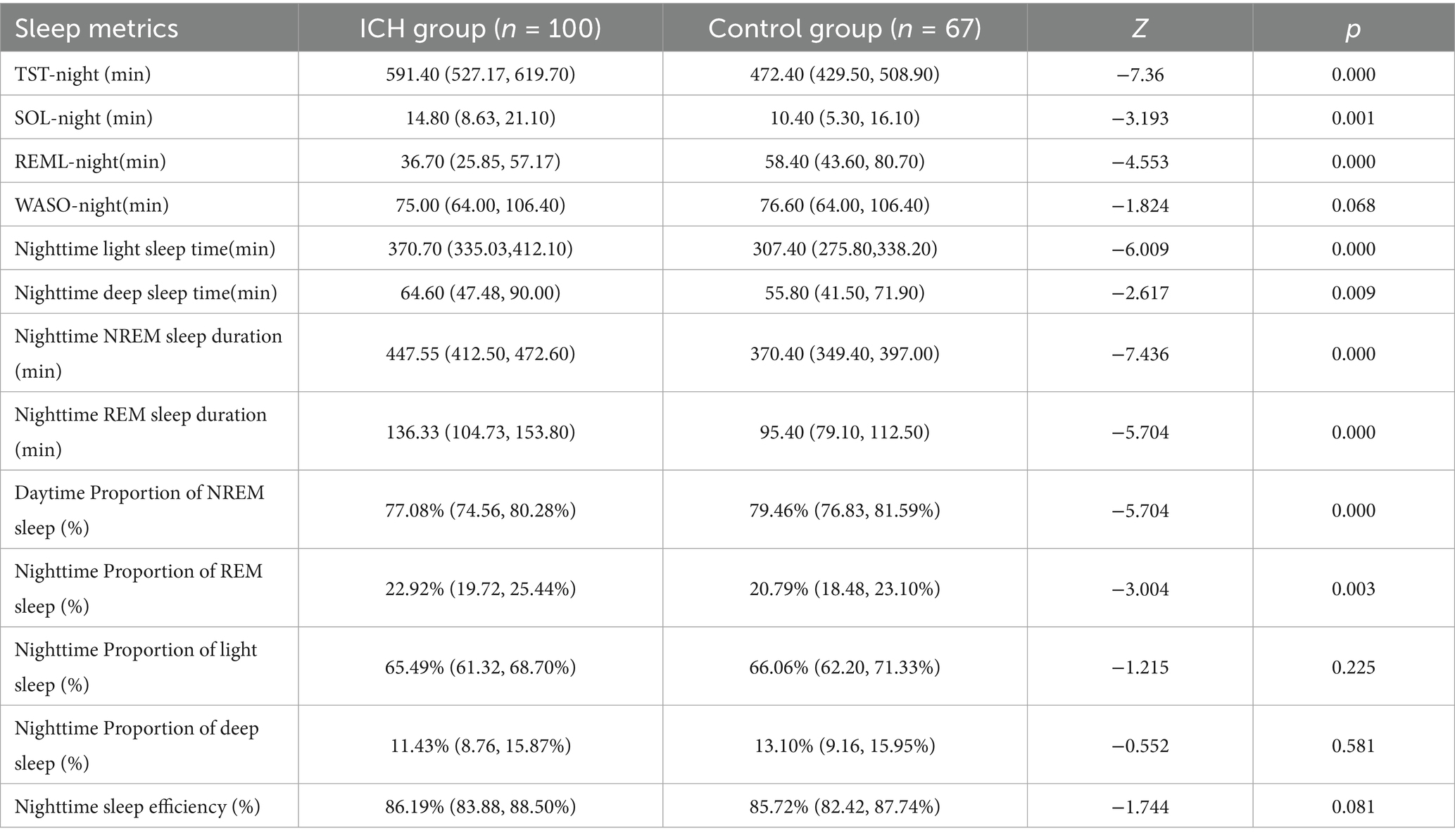 When the sleep–wake regulatory network is disrupted, significant diurnal and nocturnal alterations in sleep–wake behavior are evident. In our study, patients exhibited increased durations and proportions of light sleep, deep sleep, NREM and REM stages, as well as elevated sleep efficiency. Conversely, sleep latency, REM latency, and the proportion of NREM sleep were reduced during both day and night (Figures 3, 4). These results are consistent with a recent study (Maas et al., 2020) using actigraphy, which showed that patients with intracerebral hemorrhage rapidly entered a state of behavioral quiescence, suggesting an adaptive brain response to severe acute stress that favors immobility rather than wakefulness—potentially beneficial for recovery. This hypothesis is supported by animal models exploring sleep under stress, which indicate that sleep plays a conserved role in mitigating cellular homeostatic disturbances (Hill et al., 2014). Moreover, a retrospective cohort study (Alabdali et al., 2025)reported that such hypersomnolence during the acute phase could persist into the rehabilitation period after discharge in a subset of patients, thereby adversely affecting quality of life and long-term outcomes.
