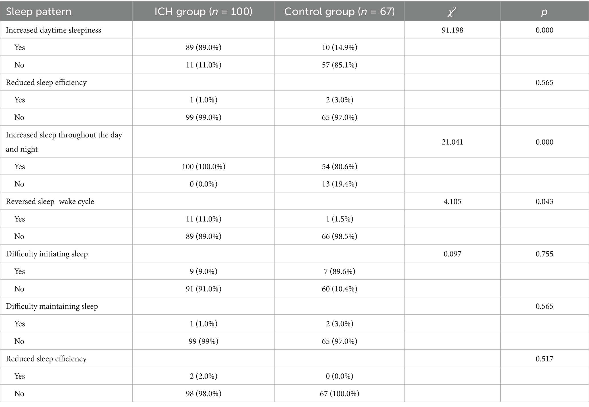 Table 6. Comparison of circadian sleep–wake pattern types between the hemorrhagic stroke group and the control group.