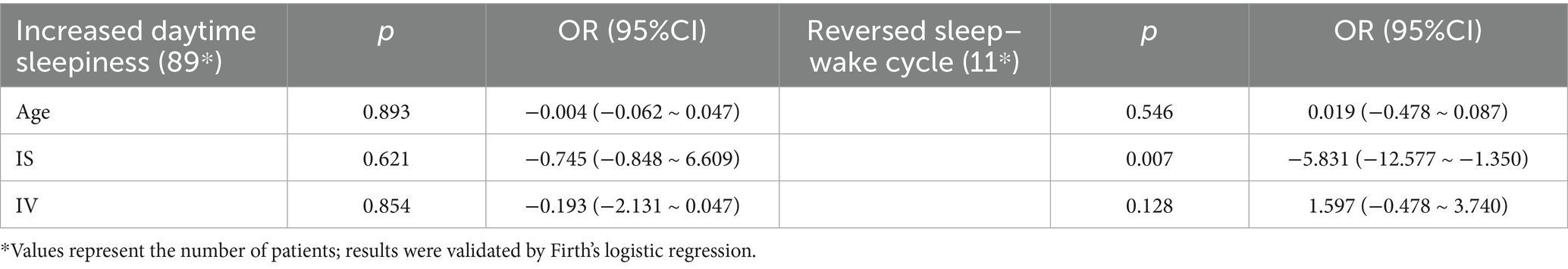 To explore the relationship between circadian rhythm parameters and specific sleep–wake phenotypes during the acute phase of hemorrhagic stroke, logistic regression analysis was performed using excessive daytime sleep and sleep–wake cycle inversion as dependent variables, and IS and IV as independent variables. Age was included as a covariate in the model to control for this confounding factor. The results indicated that IS was significantly associated with the presence of sleep–wake cycle inversion (Table 6).
