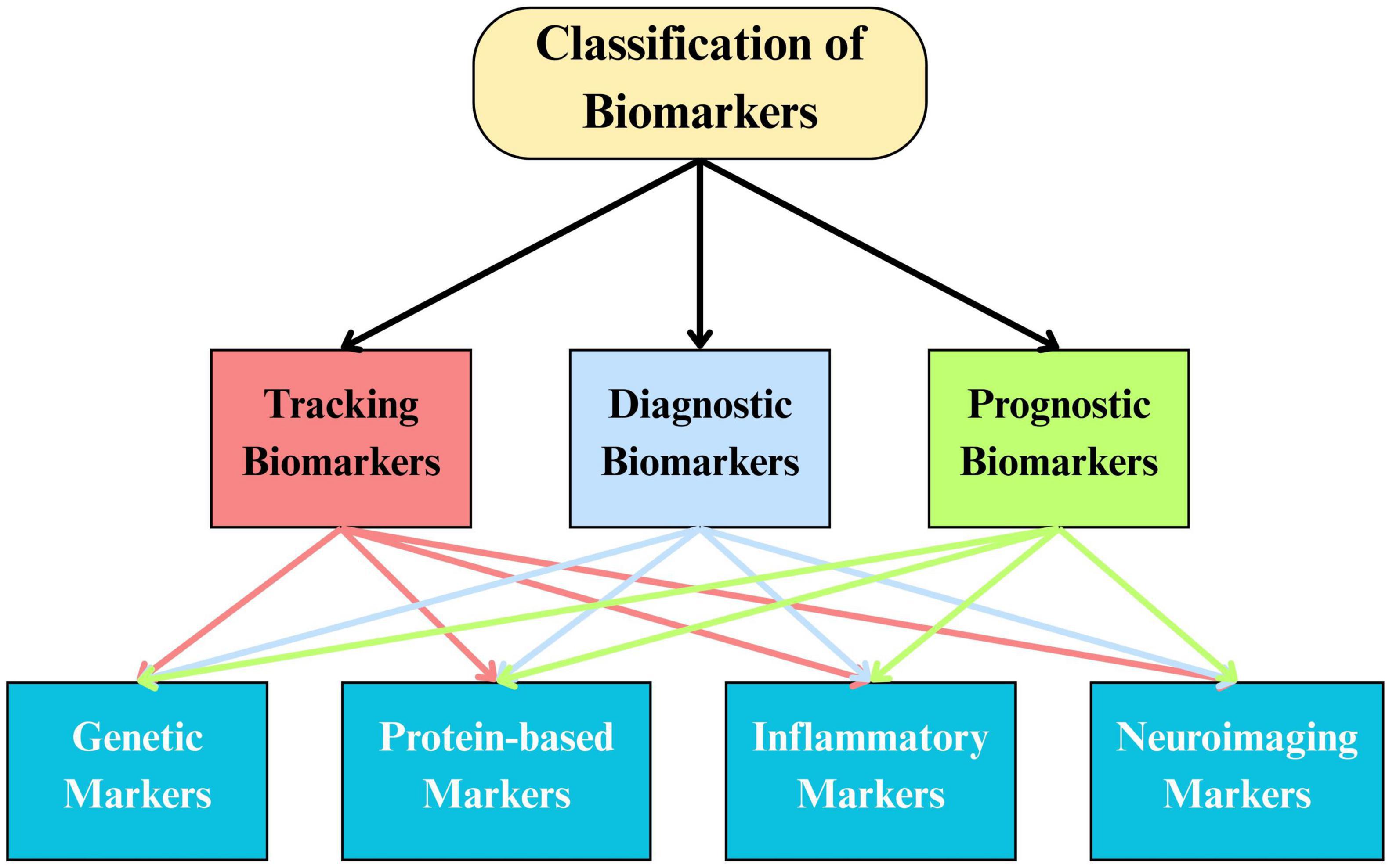 Biomarkers play an essential role in neurodegenerative disease research, offering measurable indicators of disease presence, activity, and treatment response. In ALS, biomarkers are typically classified by their diagnostic, prognostic, or pharmacodynamic value and include protein-based, genetic, inflammatory, and imaging markers (Figure 1) (Turner and Benatar, 2015). These tools not only facilitate understanding of the disease’s pathophysiology but also serve as surrogate endpoints in clinical trials, allowing earlier and more objective evaluation of therapeutic effects.