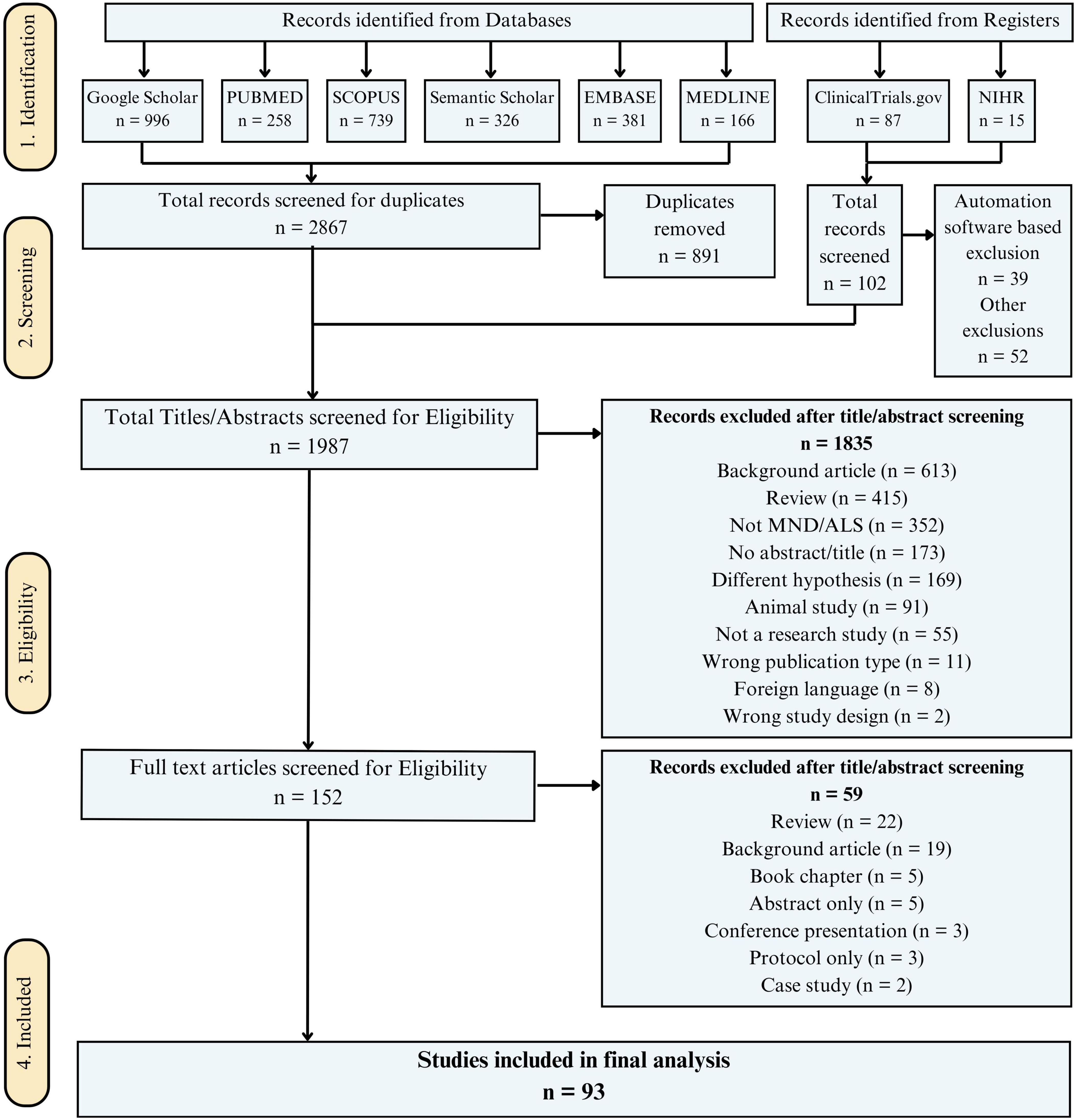 A total of 2,867 records were identified from databases (Google Scholar: 996; PubMed: 258; Scopus: 739; Semantic Scholar: 326; EMBASE: 381; MedLine: 166), along with 102 additional records from websites and registers (ClinicalTrials.gov: 87; Registers: 15). After removing 891 duplicates, 1,987 records remained for screening. Automation tools excluded 39 records, and 52 were excluded for other reasons. Following title and abstract screening, 1835 records were excluded, primarily due to being background articles (613), reviews (415), or unrelated to MND or ALS (352). A total of 152 full-text articles were assessed, with 59 excluded, leaving 93 studies for the final analysis, summarized in Figure 3.