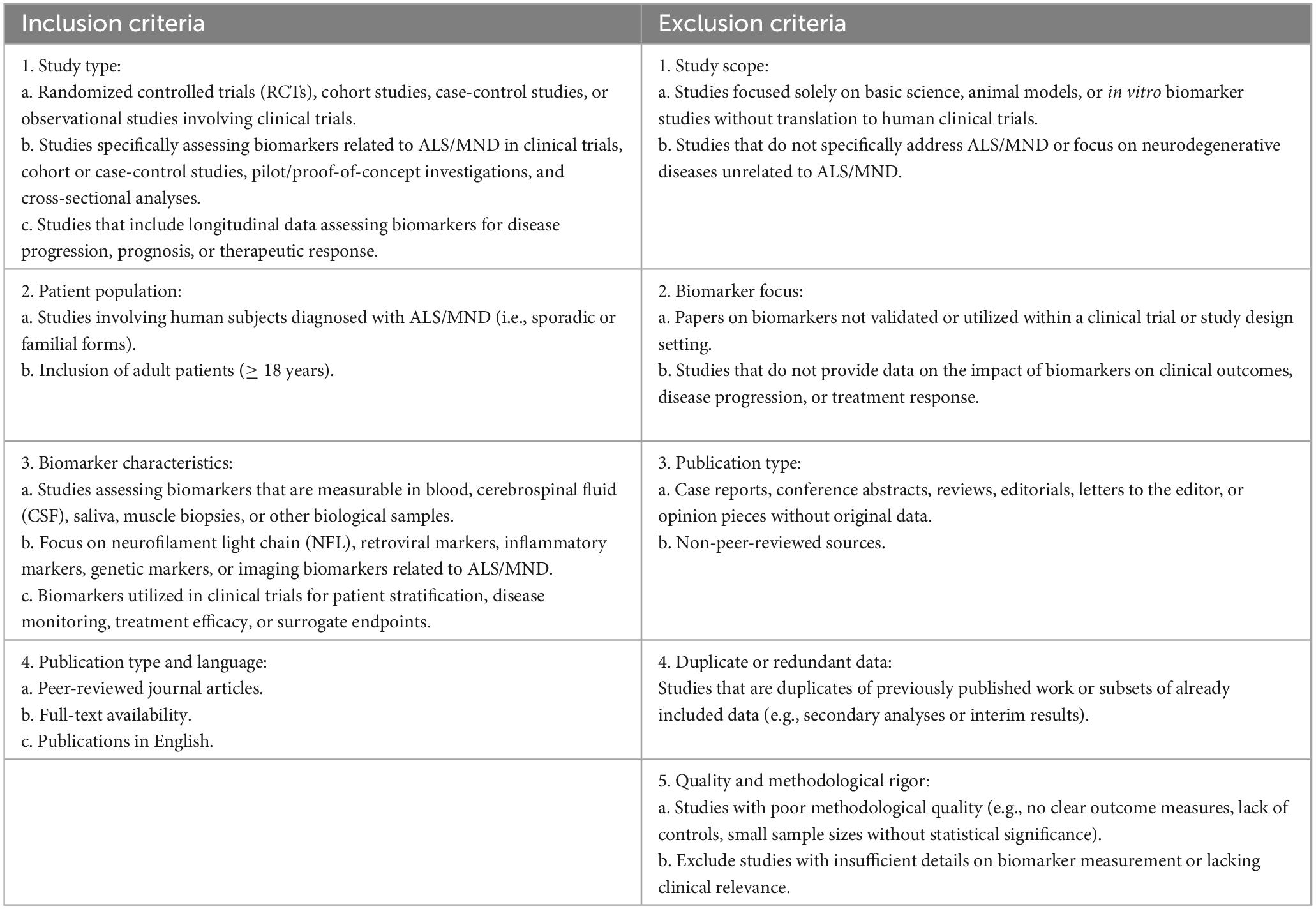 A systematic, unbiased literature search was conducted on 15th May 2025, using PubMed, Embase and putting the same search terms into Google Scholar. PubMed search was conducted using the terms {[(Motor Neuron(e) Disease*) OR (Amyotrophic Lateral Sclerosis*)] AND (Biomarkers)} AND [Clinical Trial(s)] with the headings exploded to include relevant subheadings including ALS. On Medline and Embase, search was conducted using the terms Amyotrophic Lateral Sclerosis, Motor Neuron Disease, Biomarkers and Clinical Trials. Google Scholar was searched with the terms “amyotrophic lateral sclerosis,” “motor neuron disease,” “biomarkers,” “clinical trials.”
