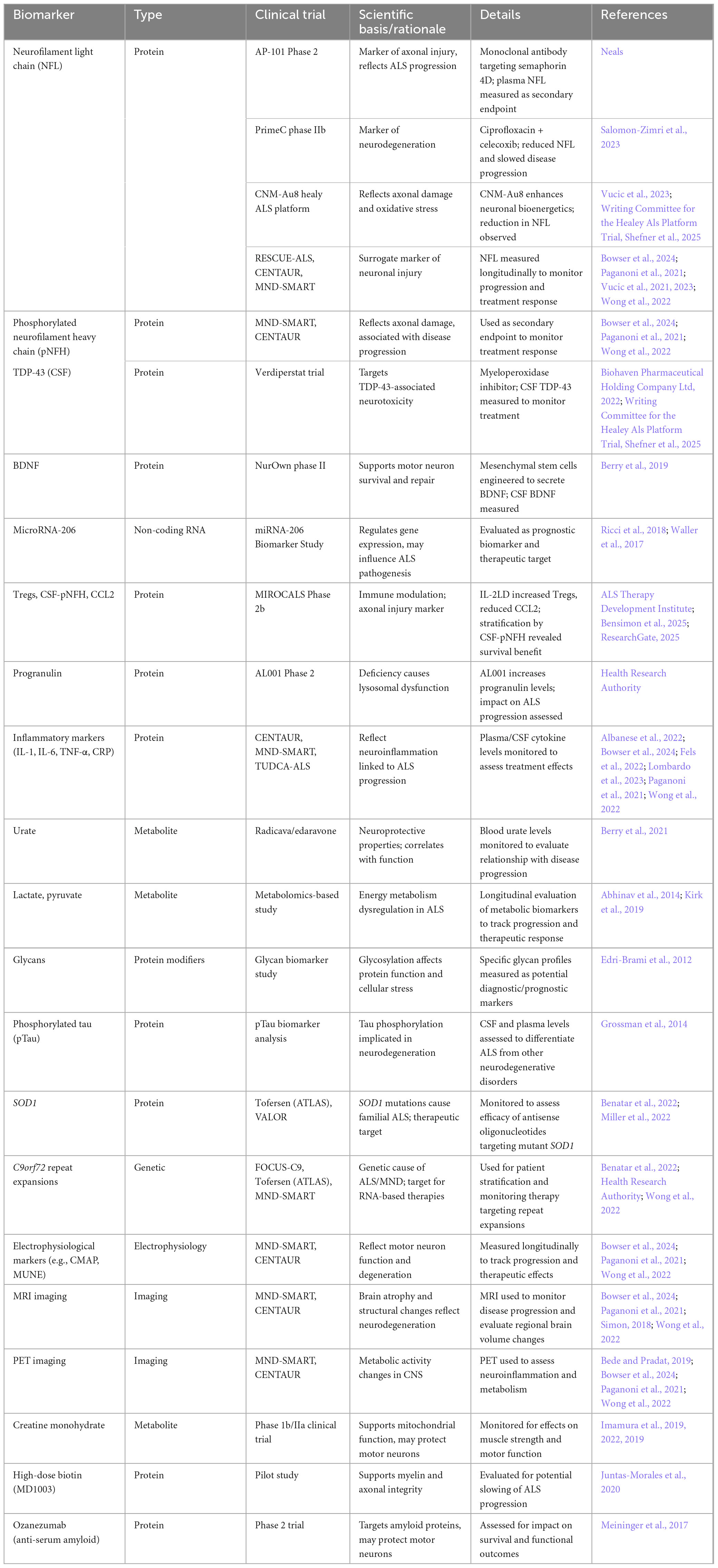 Neuroinflammation is a key pathophysiological feature in ALS, and inflammatory biomarkers such as IL-6, TNF-α, IL-1, and CRP have been extensively studied (Belge et al., 2002; Berry et al., 2019; Bowser et al., 2024; Witzel et al., 2022). Observational studies consistently report that elevated cytokine levels correlate with faster functional decline. In clinical trials like MND-SMART and TUDCA-ALS (Fels et al., 2022; Fleming and Powers, 2012; Juntas-Morales et al., 2020; Lombardi et al., 2019; Lombardo et al., 2023; Wong et al., 2022), these markers were used as secondary endpoints to quantify immune modulation and therapeutic effects, offering mechanistic insights into the efficacy of anti-inflammatory or immunomodulatory treatments. The MIROCALS trial illustrates this principle: stratifying patients based on CSF-pNFH and regulatory T-cell (Treg) levels revealed a survival benefit in those with lower axonal damage and enhanced immune regulation, demonstrating how combining inflammatory and axonal biomarkers can improve patient selection and interpret treatment outcomes (Bensimon et al., 2025; Imamura et al., 2022).