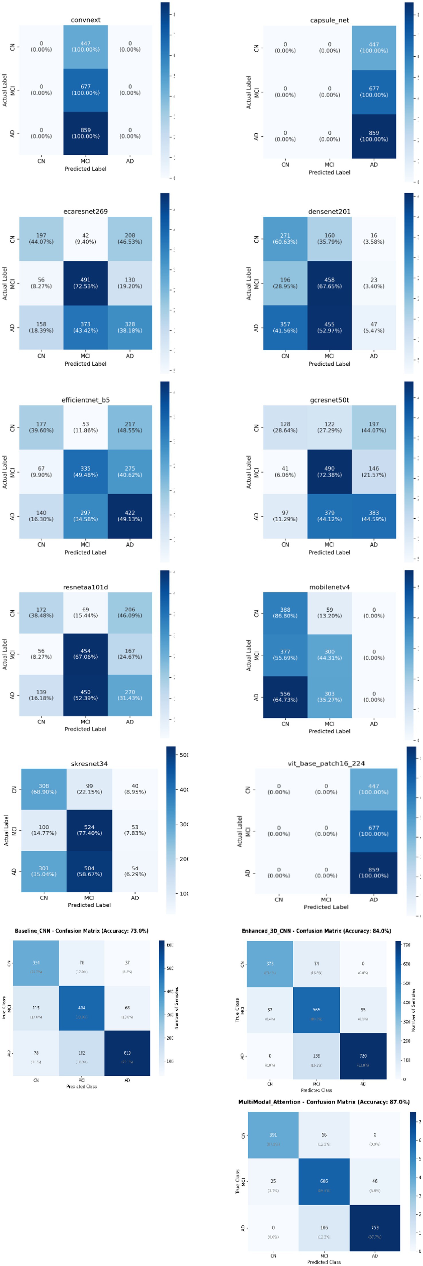 As shown in Table 3, the performance metrics associated with CapsNet, Convnext and ViT revealed significant imbalances in the model’s predictive capabilities across different classes (CN, MCI, and AD). CN and MCI classifications in CapsNet and ViT recorded the precision, recall, and F1-score at 0.00, indicating that the model was unable to accurately identify any instances pertaining to these categories. As well as AD cases in Convnext and Mobilenetv4.