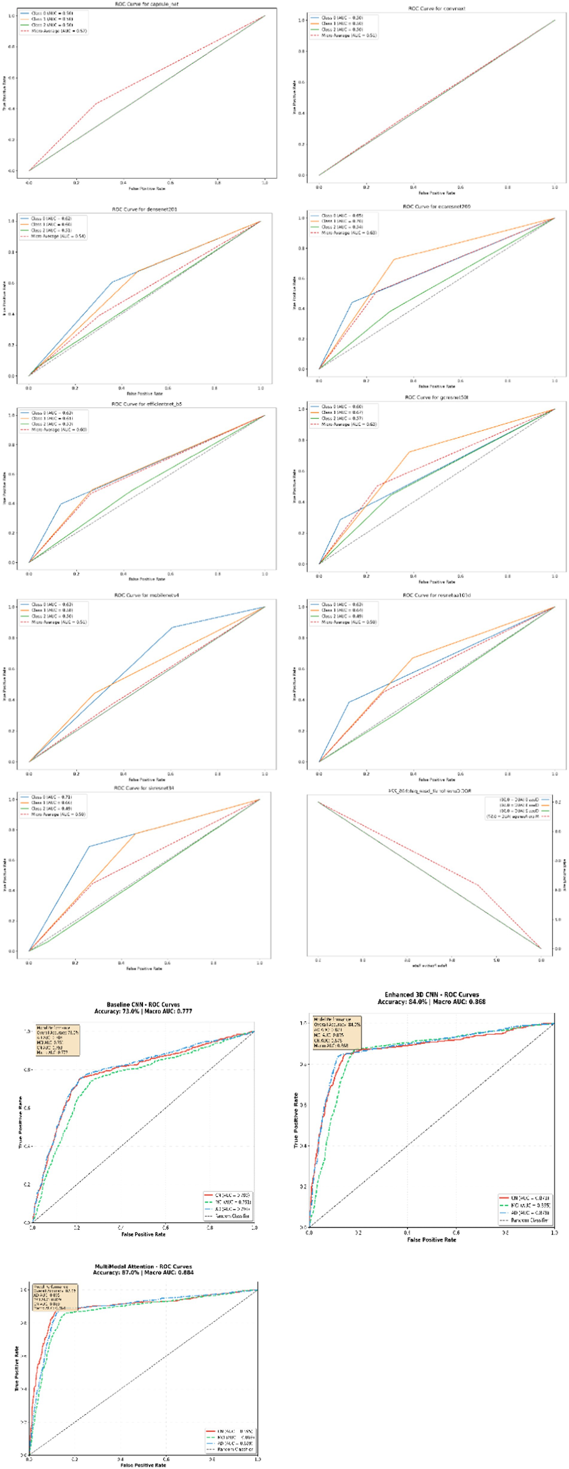 A shown in Table 2, ROC AUC (Micro and Macro) evaluates the model’s capability to distinguish between classes (Bayahya et al., 2022). Multimodal Attention excelled in both micro and macro-ROC (0.88) whereas CapsuleNet, ConvNeXt, and ViT reached the lowest macro-ROC AUC (0.5000), indicating no better performance than random chance.