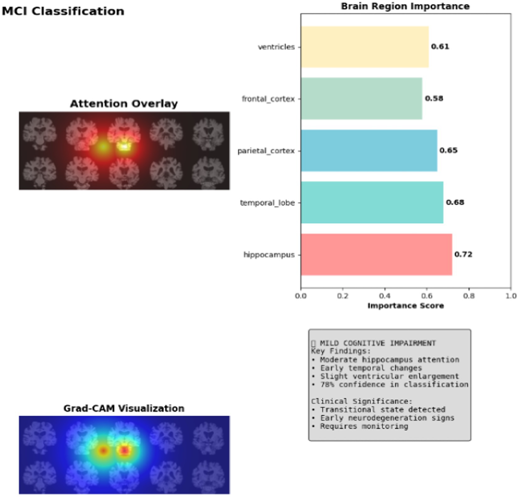 Grad-CAM analysis displays moderate activation patterns with 0.72 attention weights in the hippocampus and emerging temporal lobe changes at 0.68 intensity in MCI class. The visualization shows orange-yellow heatmap regions indicating early pathological changes, where the model detects subtle structural alterations with 78.1% confidence, representing the transitional state between normal aging and Alzheimer’s disease progression as shown in Figure 7.