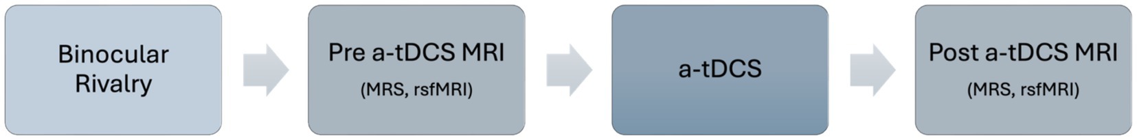 Methods: Fourteen participants with normal vision completed two brain imaging sessions at least 48 hours apart. In each session, binocular rivalry dynamics, primary visual cortex GABA and glutamate-glutamine (Glx) concentrations (via magnetic resonance spectroscopy (MRS)) and resting-state functional connectivity (via task-free fMRI) were measured at baseline. Real or sham a-tDCS (20 min, 2mA) was then applied to the visual cortex in a randomized sequence followed by a second set of MRS and fMRI measurements.