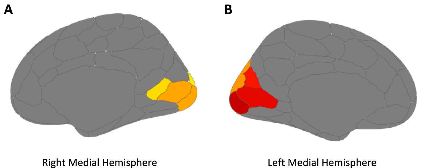 Figure 2. Brain regions chosen for voxel analysis of resting-state functional connectivity using Schaefer Atlas parcellation (Schaefer et al., 2018) in the right (A) and left; (B) medial hemisphere along the calcarine fissure. Colors are arbitrary.