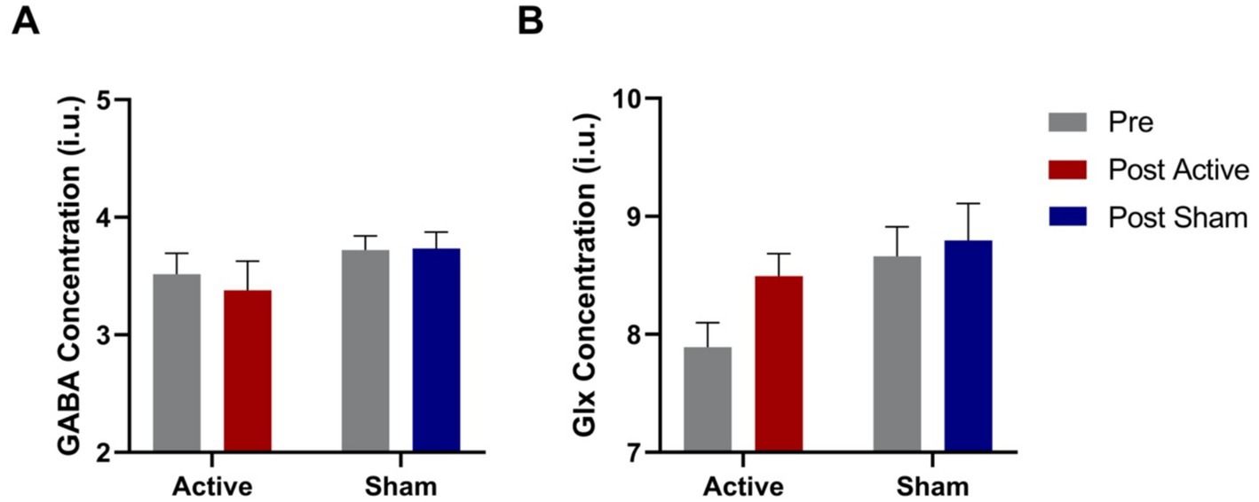 Figure 3. Pre and post GABA (A) and Glx (B) concentrations in the visual cortex for both active and sham conditions. N = 13. Error bars = SEM.