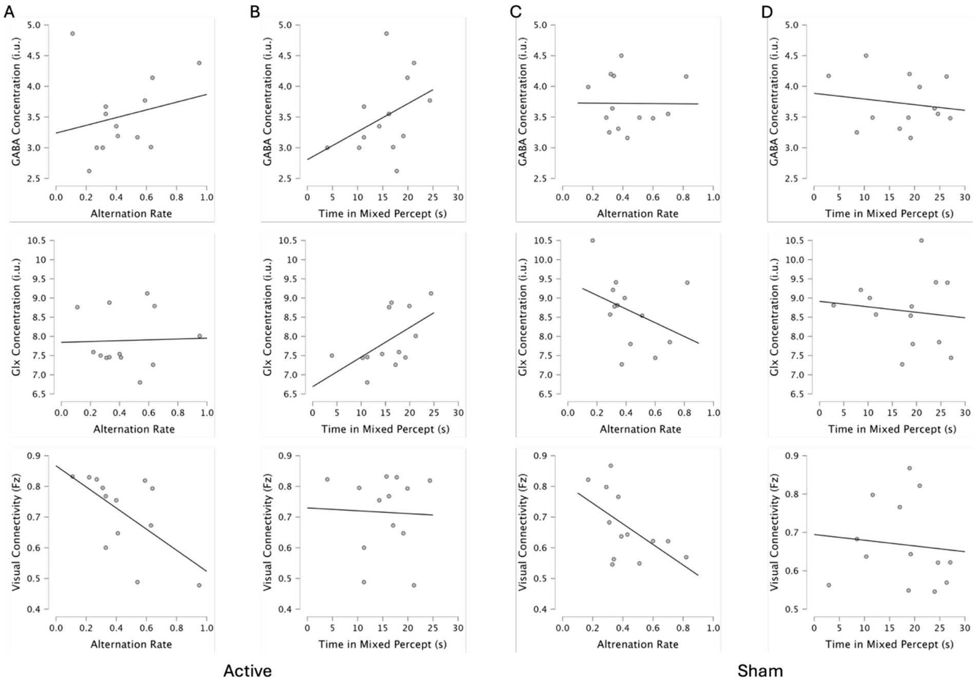 Figure 4. Correlation plots for active and sham conditions alternations rates (A,C) and time spent viewing mixed percept (B,D) with GABA concentration, Glx concentration, and visual connectivity.